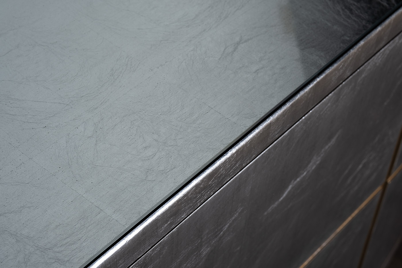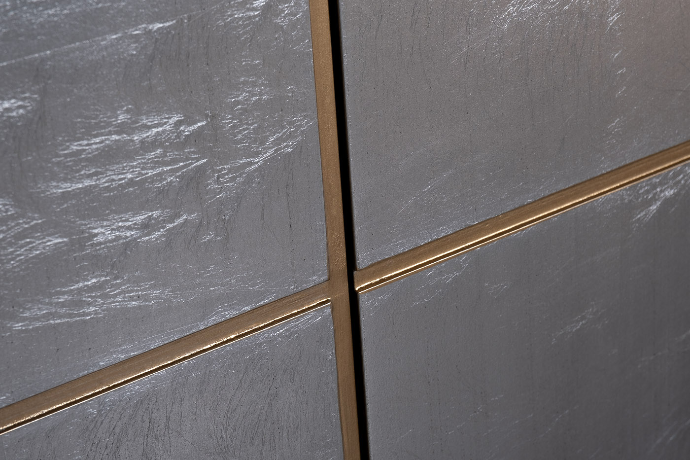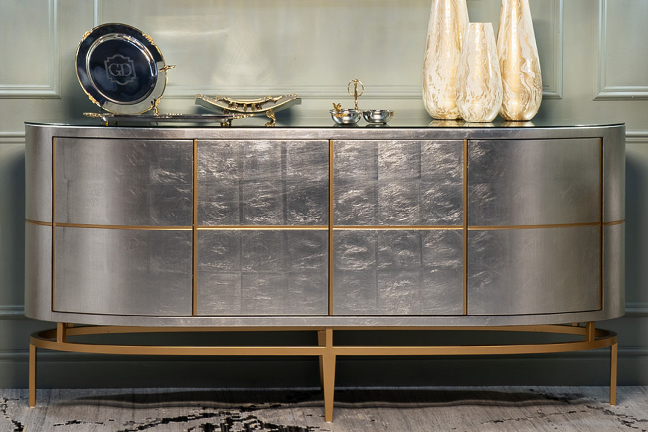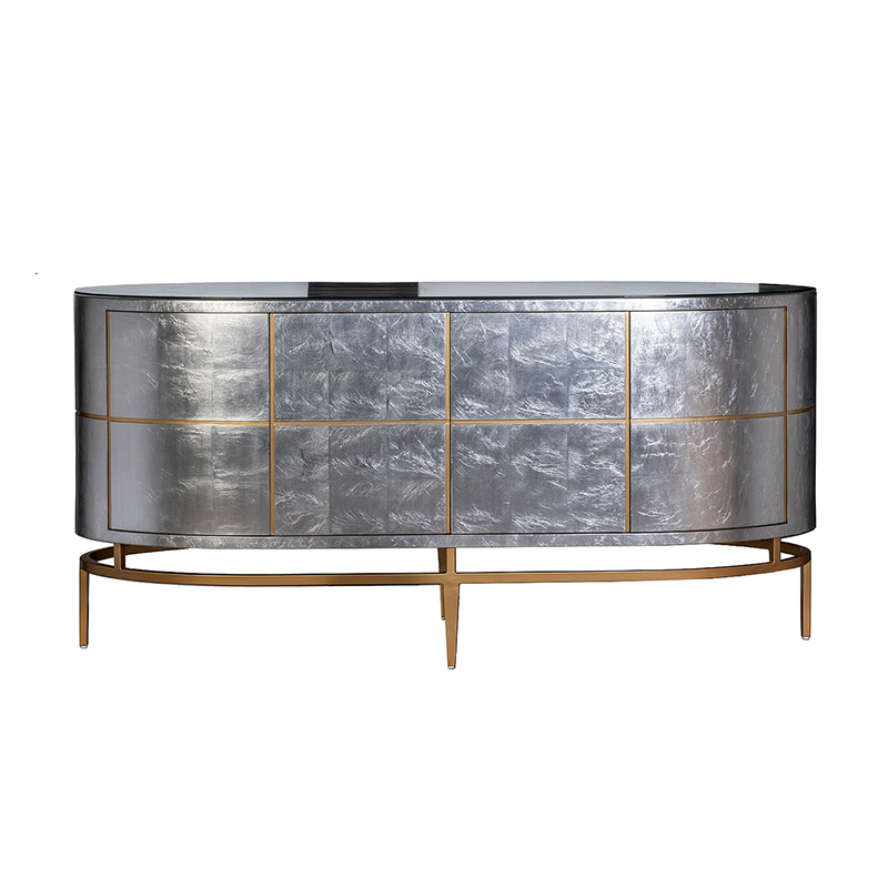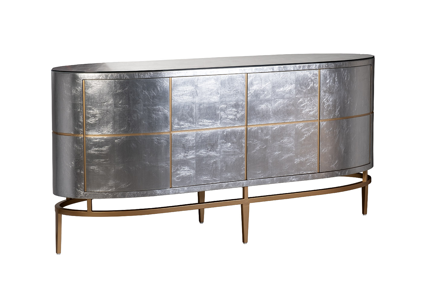 Запросить индивидуальное предложениеФутуристичный дизайнерский комод потрясает чистотой линий и минималистичностью форм. В начале ХХ века для произведений живописи и архитектуры в стиле футуризма были характерны длинные динамические линии и чистые геометрические формы, предполагающие новый уклад жизни, движение и обновление. Вертикальные и горизонтальные вставки золотисто-медного цвета, овальная опора с ножками, перекликающаяся с формой комода, делают его удивительно современным, при этом создавая вполне ощутимую иллюзию стиля 10-х годов прошлого века. Корпус комода покрыт тончайшими листьями серебристой фольги и покрыт сверху лаком по авторской технологии. Четыре распашные дверцы с механизмом push-to-open открывают доступ в два боковых и одно центральное отделение с полкой. В комплект входит дополнительная стеклянная столешница, защищающая поверхность от царапин. Комод прокрашен и залакирован со всех сторон, чтобы устанавливать его в любом месте помещения.