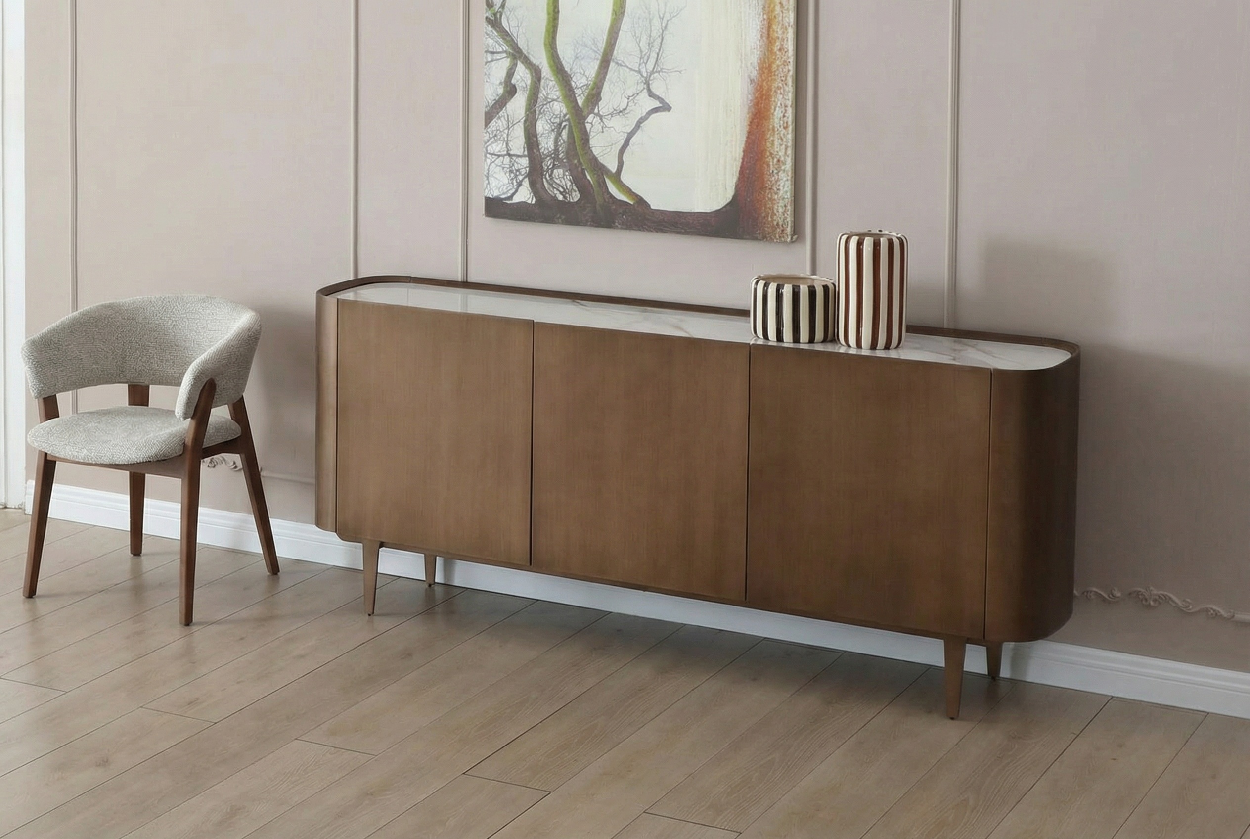 Плавно закруглённые боковые линии придают силуэту обтекаемость и визуальную лёгкость, делая буфет гармоничным элементом пространства. Благодаря ширине 180 см модель остаётся вместительной, не перегружая интерьер.