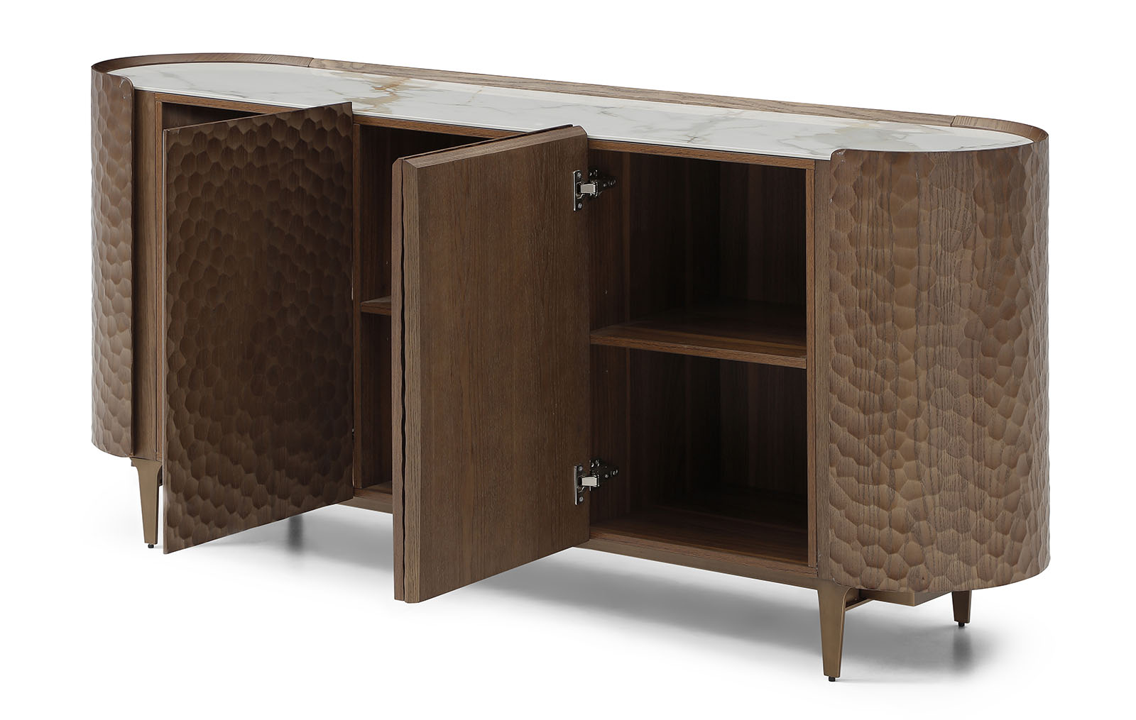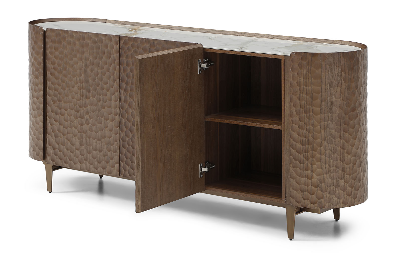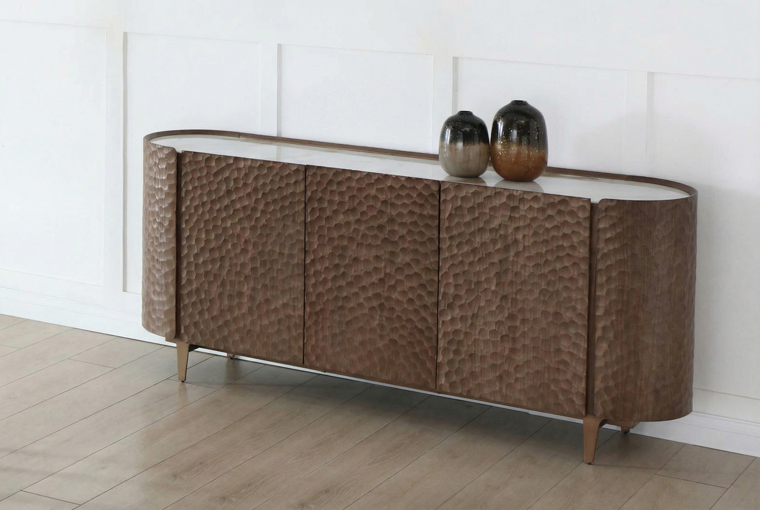 Буфет Sicilia (Сицилия) - выразительный предмет интерьера, в котором сочетаются декоративный дизайн и современные технологии. Его главная особенность - фасады с объемной текстурой, созданной с помощью ЧПУ-обработки. Рельефный рисунок напоминает ручную чеканку и придаёт поверхности глубину, игру света и тактильную привлекательность.