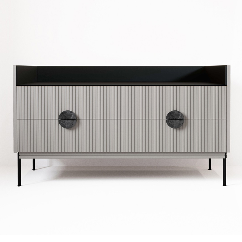 Запросить индивидуальное предложениеКорпус комода выполнен из мдф, покрытие эмаль Ral 7047/Ral 7015.Ножки- металл, покрытие-черная эмаль. Ручки-мрамор (Цвет мрамора может отличаться от цвета на фото, ввиду того, что это натуральный материал и имеет неоднородную окраску, также это зависит от партии материала). Выдвижные ящики оснащены доводчиками (Австрия).