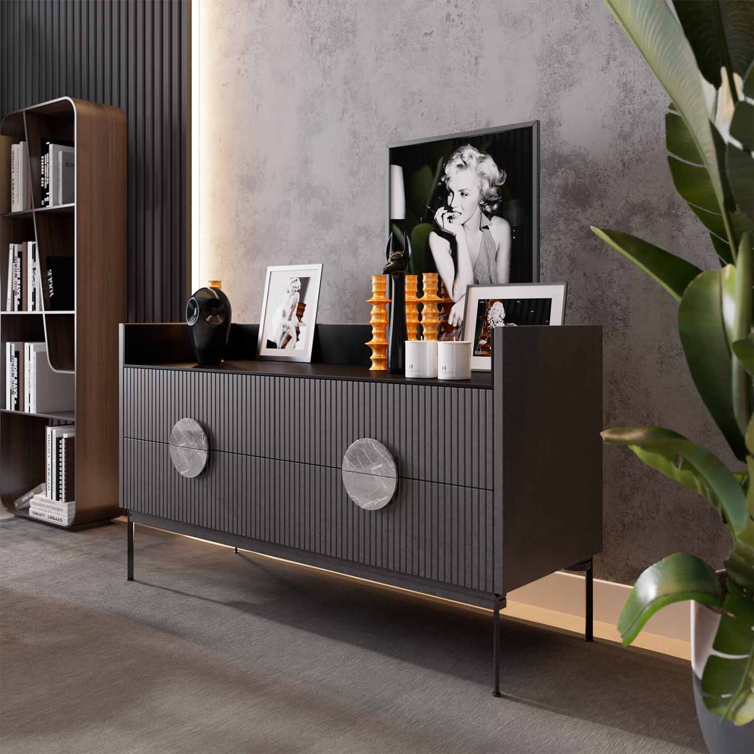 Запросить индивидуальное предложениеКорпус комода выполнен из уникального экологичного, древесного волокна, тонированного органическими красителями в массе “Living color” (Португалия). Ножки- металл, покрытие-черная эмаль, Ral 9011. Ручки-мрамор. Выдвижные ящики оснащены доводчиками (Австрия). Living color- это уникальный материал из древесного волокна, экологичный, прочный, влагостойкий, тонированный органическими красителями в массе. Доступно 3 варианта цвета, на выбор. Также возможно окрашивание в индивидуальный цвет Покупателя по Ral, (материал мдф). Поставляется в собранном виде. Необходимо будет установить корпус комода на основание.