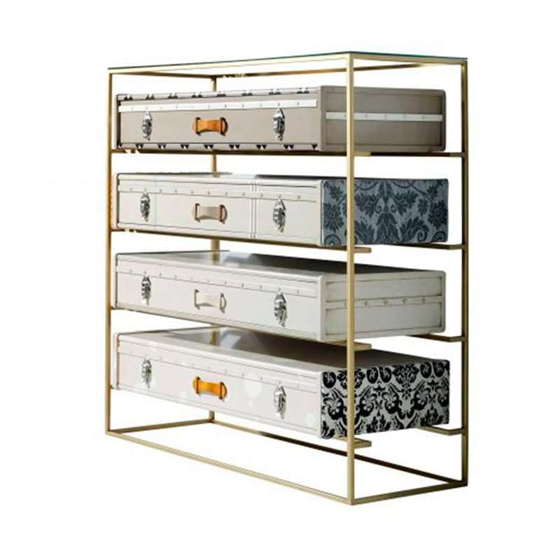 Серия Suitcase была создана для создания открытой гардеробной из модулей, подвешенных на алюминиевых профилях. Но эластичность, которую мы в нем обнаружили, дала нам возможность превратить их в другие самостоятельные предметы, например, в этот великолепный комод с четырьмя выдвижными ящиками, железным каркасом, покрытым золотым лаком, и стеклянной верхней полкой. Ящики, сложенные так, как будто они ждут, когда их заберут в вагоне поезда, являются копией старых чемоданов, оформленных в истинном стиле Lola Glamour. Бесконечные возможности: выбирайте из разных вариантов отделки и играйте с размерами и особенностями интерьера.
