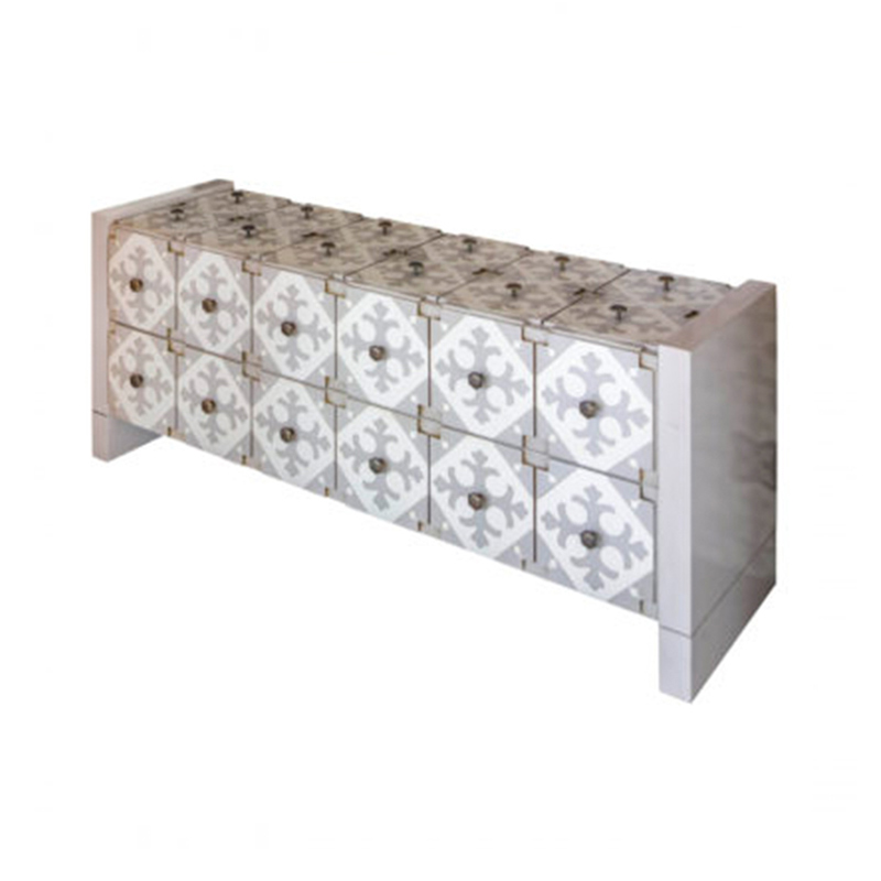 Он выглядит как керамика в чистейшем гидравлическом стиле, но представляет собой деревянные панели, расписанные вручную. Наша специализация - создавать уникальные эффекты с помощью лака и цветов. Четырехугольный дизайн усилен небольшими латунными ручками, создающими ощущение двенадцати маленьких квадратных ящиков, хотя на самом деле он состоит только из двух ящиков, внутренняя часть которых таит в себе приятные сюрпризы для любопытных и перфекционистов. Бесконечные возможности: выбирайте из разных вариантов отделки и играйте с размерами и особенностями интерьера.