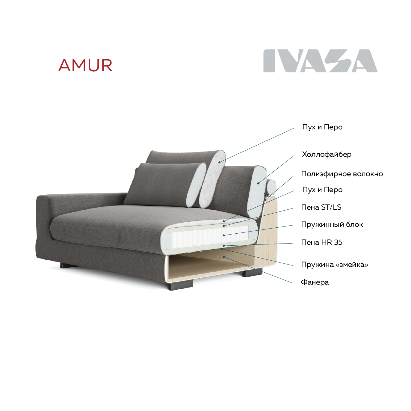 Высота: 81 Ширина: 142 Глубина: 120 Высота сидения: 45 Высота ножек: 8 AMUR стильное и уютное кресло с глубокой посадкой. Оно особенное и сочетает в себе роскошную изысканность и простоту линий. Его изящные формы делают его главным героем вашей гостиной. Коллекция состоит из 4 готовых комбинаций и модулей, которые можно комбинировать друг с другом и создавать уникальные предметы. Каркас изготовлен из массива березы. В качестве наполнителей используются высококачественный пенополиуретан различной плотности с двумя видами пружин и стерилизованное утиное перо в специальном тиковом чехле. Доступен практически в любом цвете, для обивки может быть использована ткань, натуральная или искусственная кожа. Съемные чехлы подушек позволяют в любой момент заметить их в случае повреждения. ХАРАКТЕРИСТИКИ НАПОЛНЕНИЕ: Сиденье: Пружинный блок + HR Foam 35 кг + пух и перо, смешанное с измельченной холодной пеной. Спинка: Силиконизированное полиэфирное волокно. Подлокотник: Пена HR 25, ширина – 23 см. КАРКАС: Брус сосны, мебельная фанера, змеевидная пружина по всей длине каркаса. НОЖКИ: Деревянные 8 сm, скрытые ГАРАНТИЯ: 12 месяцев на каркас 18 месяцев на обивку