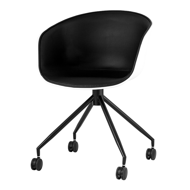 Белая спинка изготовлена из прочного PP-пластика, внутренняя обивка и подушка на сиденье – из экокожи в черном цвете. Крестовина выполнена из металла, окрашенного порошковой краской в черном оттенке. Кресло оборудовано колесиками для более удобного пользования. Высота сиденья не регулируется и составляет 48,5 см. Максимальная нагрузка до 150 кг.