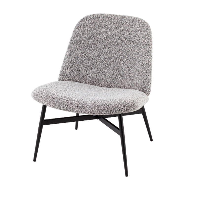 Обивка из букле, мягкая и тактильно приятная, создаёт уютную атмосферу и подчеркивает современный характер мебели. Металлический каркас и ножки в чёрном цвете обеспечивают прочность, стабильность и визуальный контраст. Спинка с наклоном и мягкое сиденье гарантируют удобство для отдыха или длительного пребывания.