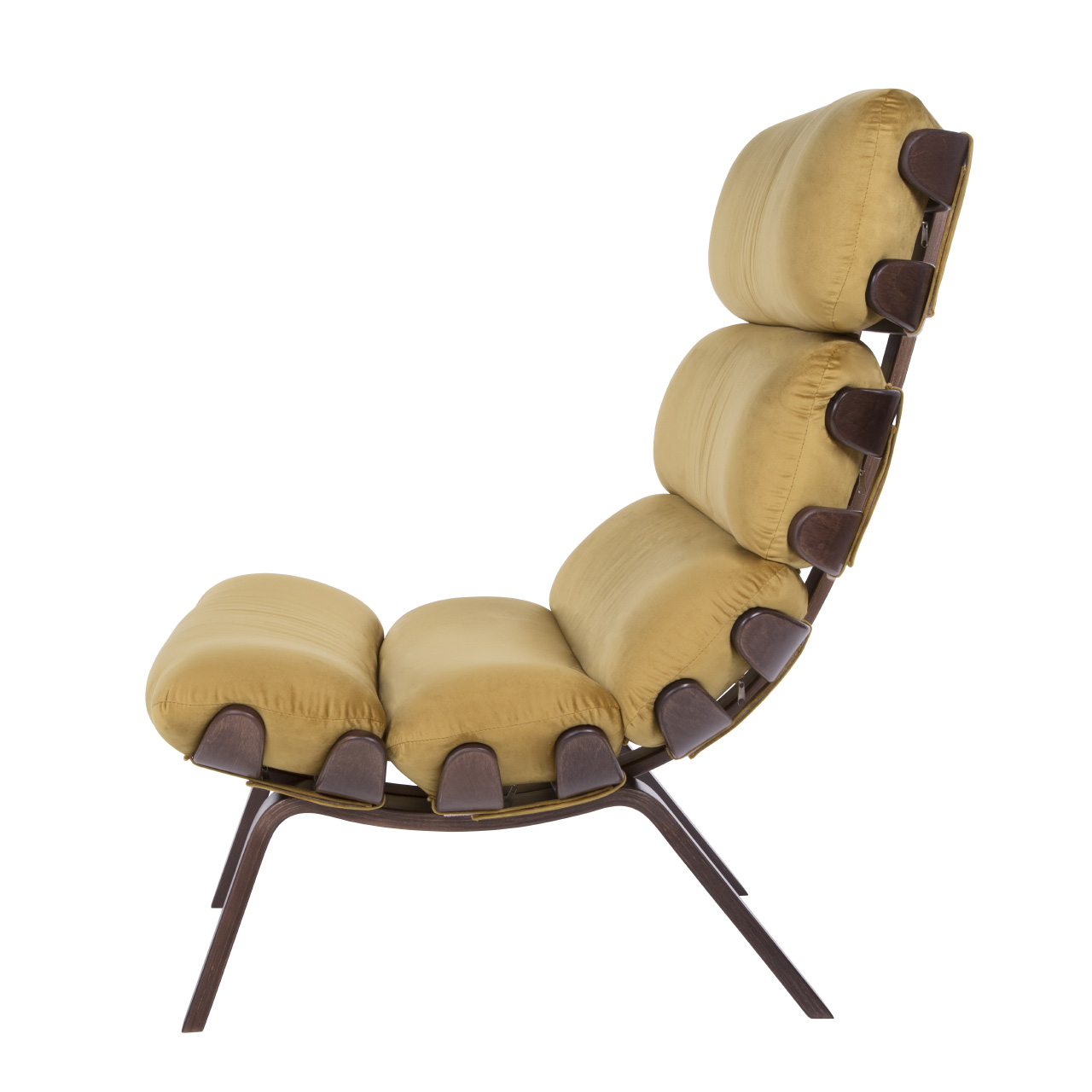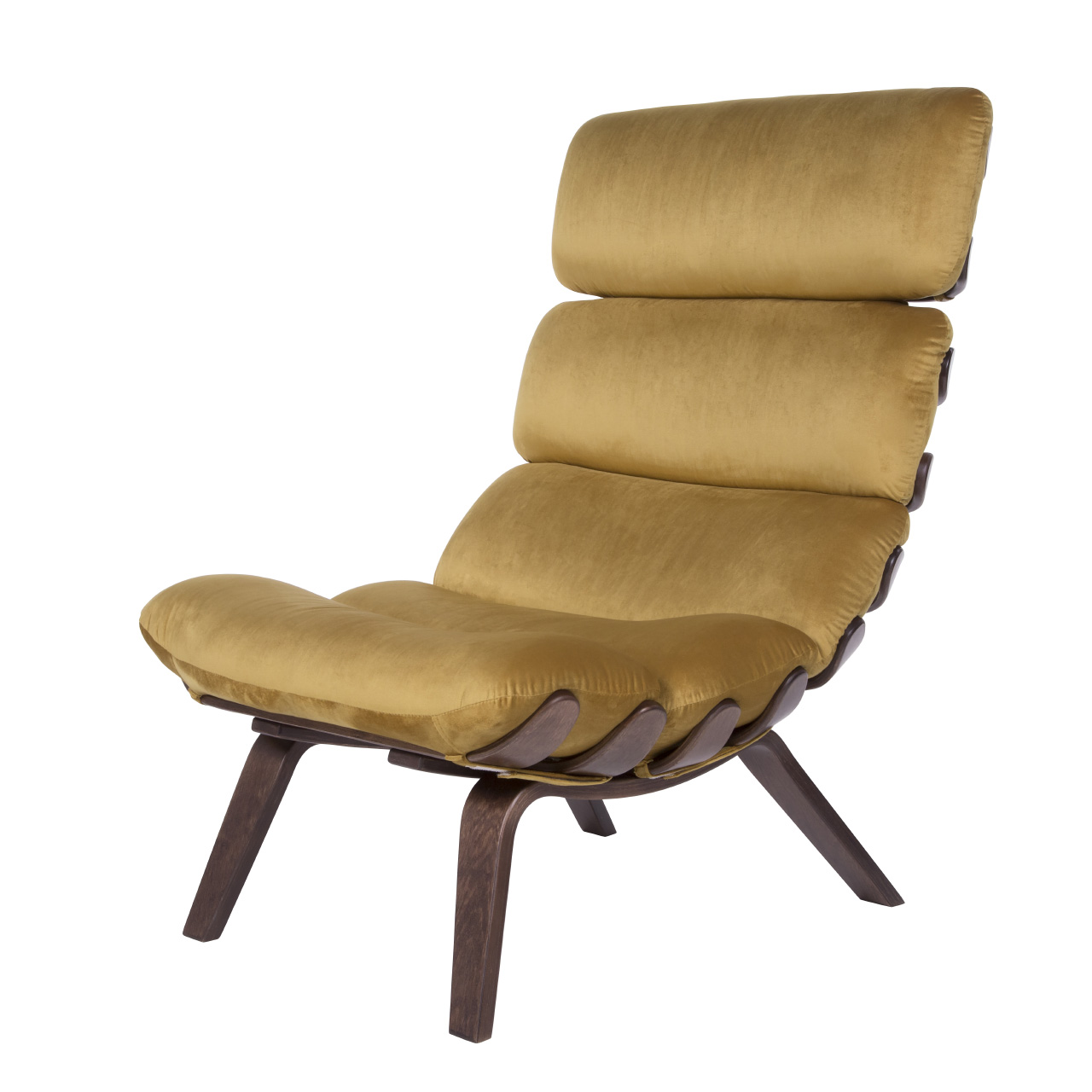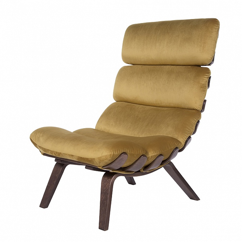 Запросить индивидуальное предложениеКресло с тканевой обивкой цвета Охра и каркасом цвета Орех.