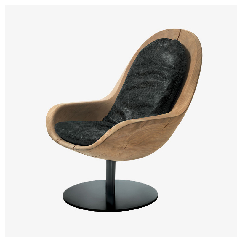 Запросить индивидуальное предложениеКресло из массива душистого кедра, изготовленного из цельного блока, характеризуется обволакивающей структурой, соединяющей сиденье и спинку. По запросу подушка из ткани или кожи с видимой строчкой. Основание с трубчатой ножкой и железной пластиной.