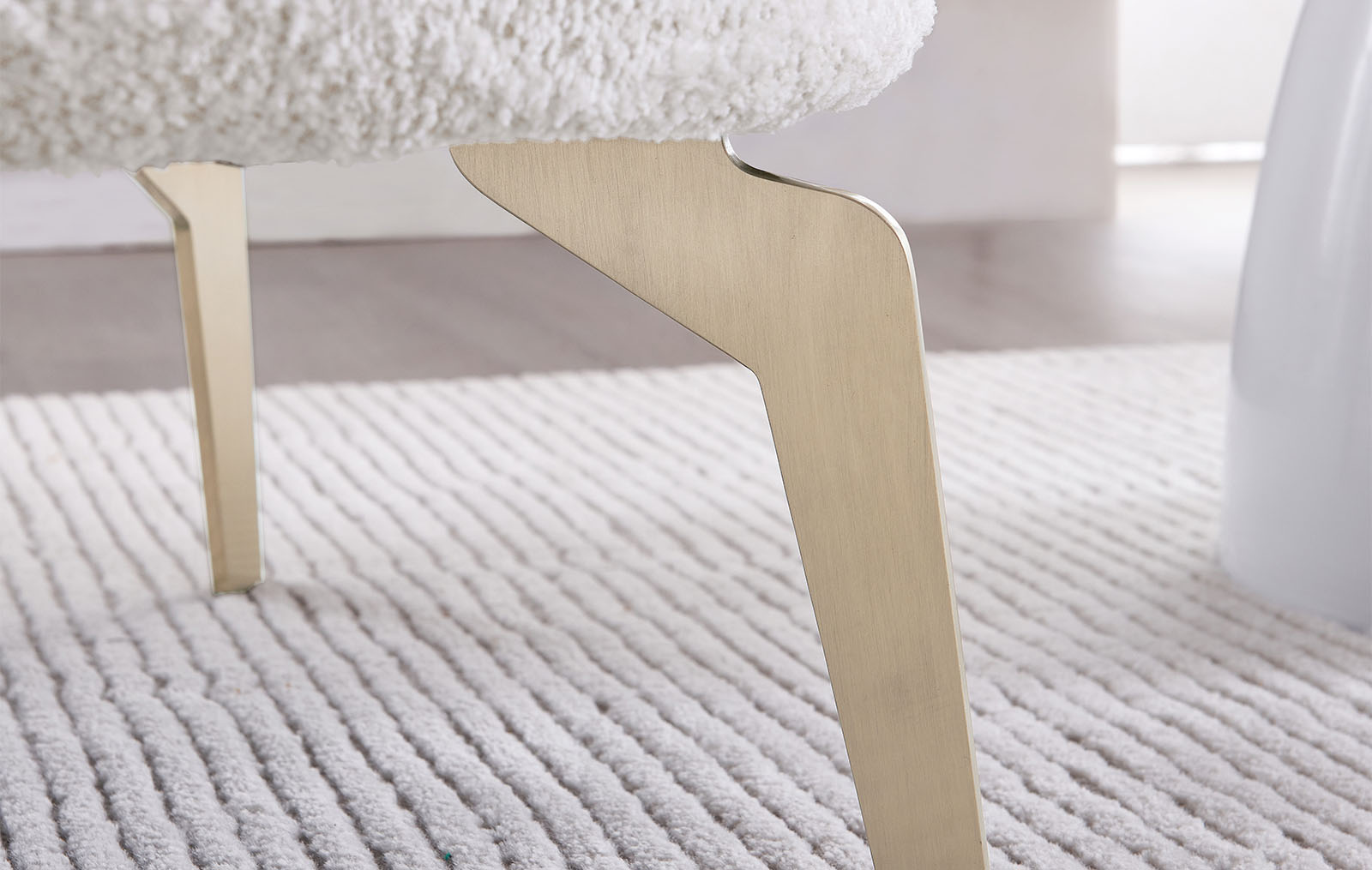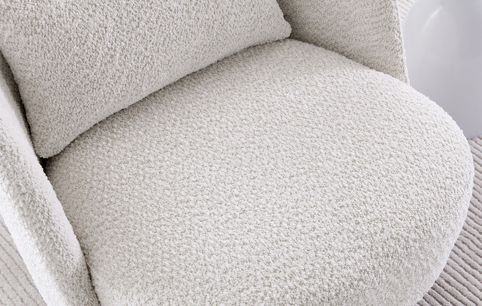 Его обивка изготовлена из ткани тедди кремового оттенка, элегантного и благородного, хорошо гармонирующего с другими цветами.