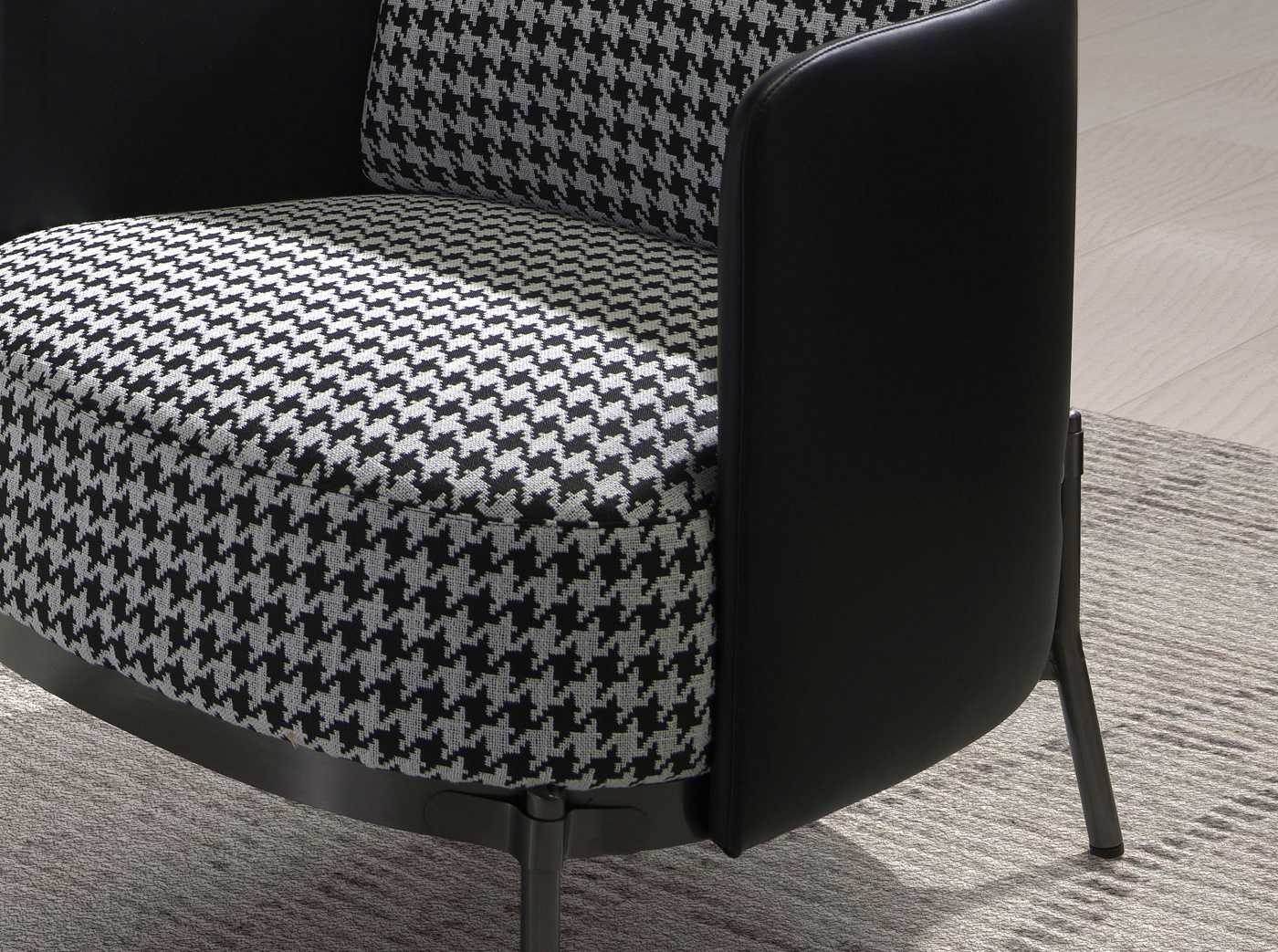Запросить индивидуальное предложениеКресло с подлокотниками современного дизайна с сиденьем, обитым черной и белой тканью, и спинкой, обитой черной кожзаменителем. Это кресло представляет собой идеальное сочетание дизайна и комфорта, как по своему стилю, так и по ножкам из затемненной полированной нержавеющей стали. Цвета отделки указываются в соответствии с каталогом производителя. Допускается незначительное отклонение в цвете, обусловленное техническими особенностями цветопередачи фотографий.