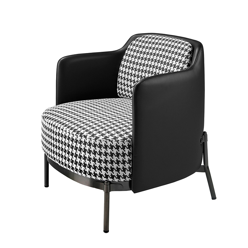 Запросить индивидуальное предложениеКресло с подлокотниками современного дизайна с сиденьем, обитым черной и белой тканью, и спинкой, обитой черной кожзаменителем. Это кресло представляет собой идеальное сочетание дизайна и комфорта, как по своему стилю, так и по ножкам из затемненной полированной нержавеющей стали. Цвета отделки указываются в соответствии с каталогом производителя. Допускается незначительное отклонение в цвете, обусловленное техническими особенностями цветопередачи фотографий.