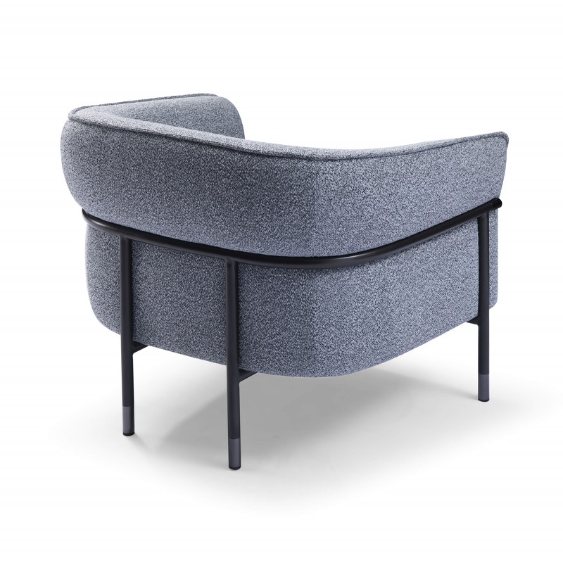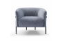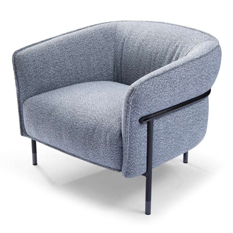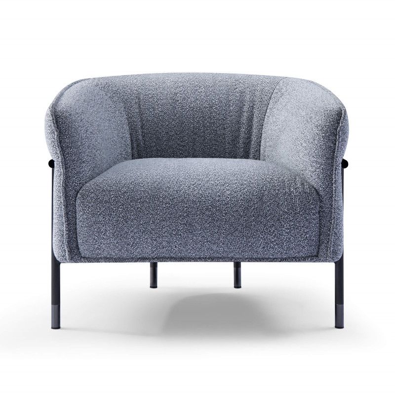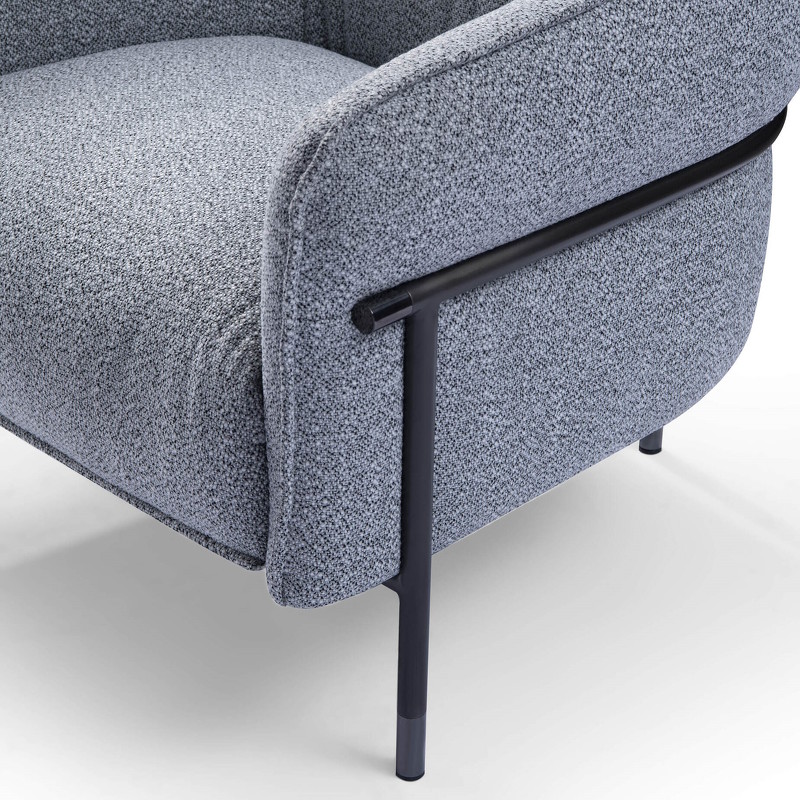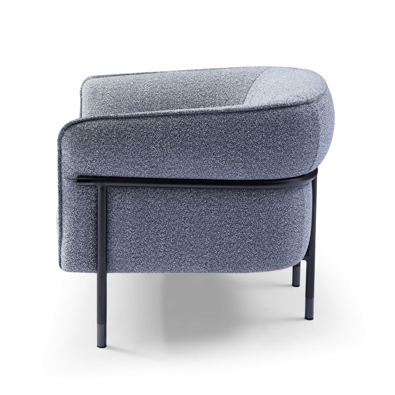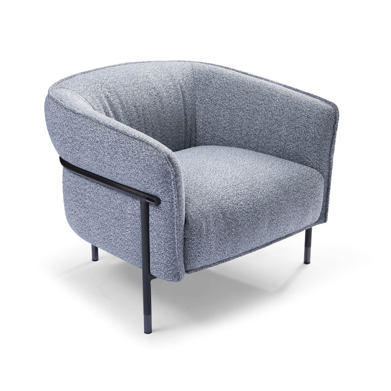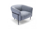 Кресло в ткани из ассортимента фабрики, дополнено утонченными черными металлическими ножками.