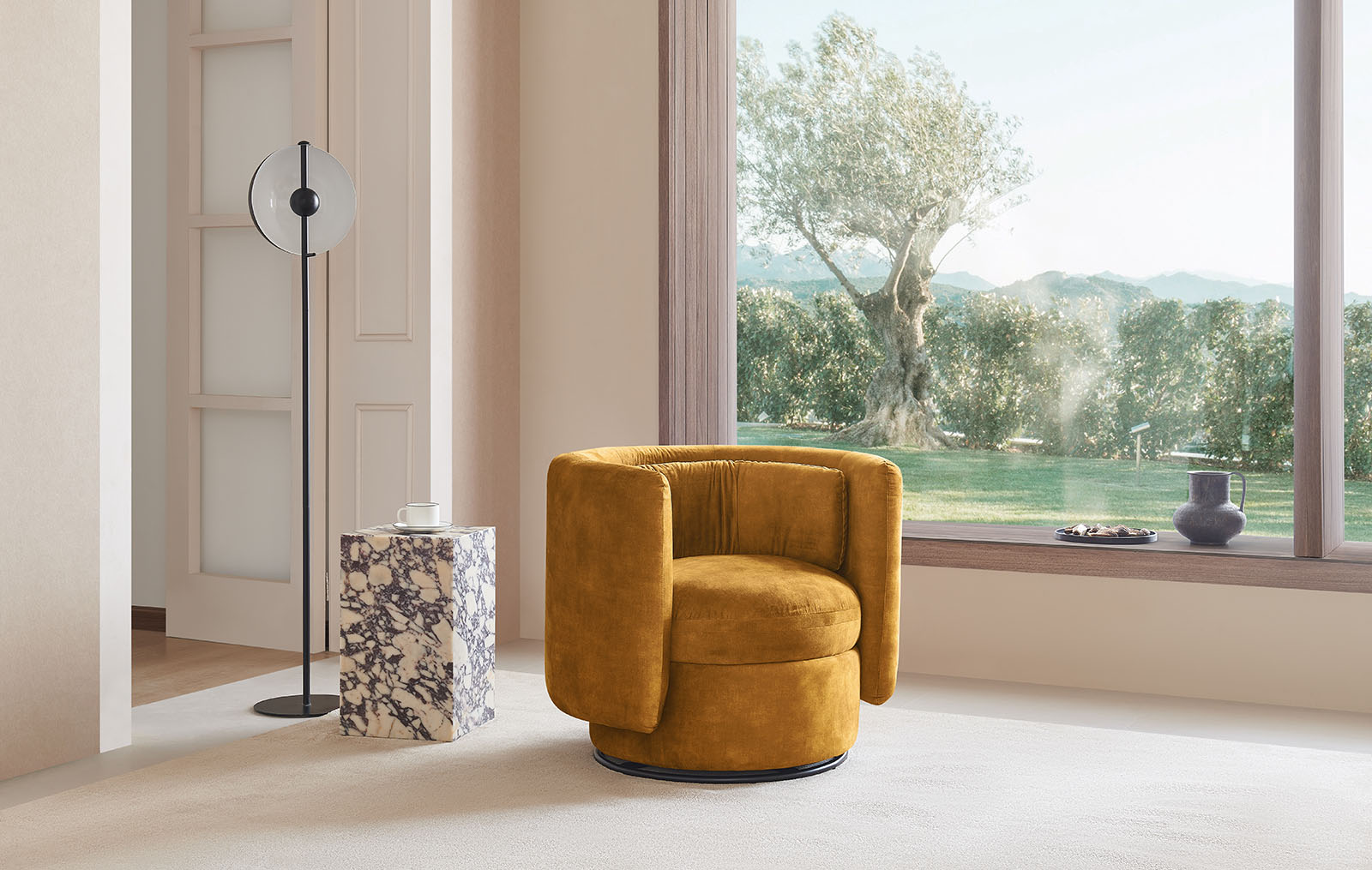 Обивка из мягкого и приятного на ощупь велюра создает уютную атмосферу, а золотистый оттенок охры добавляет изысканности и тепла в интерьер.