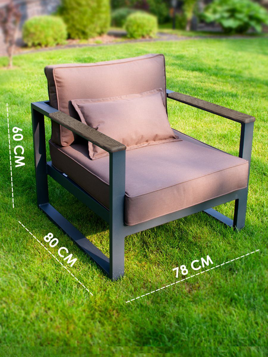 Наполнитель: многослойный формованный ППУ различной плотности, синтепон и спанбонд. Чехлы подушек на молнии. Вес каркаса: 9,2 кг. Продукция поставляется в собранном виде (кресло + комплект подушек). Нагрузка до 120 кг. Гарантия: 12 месяцев.