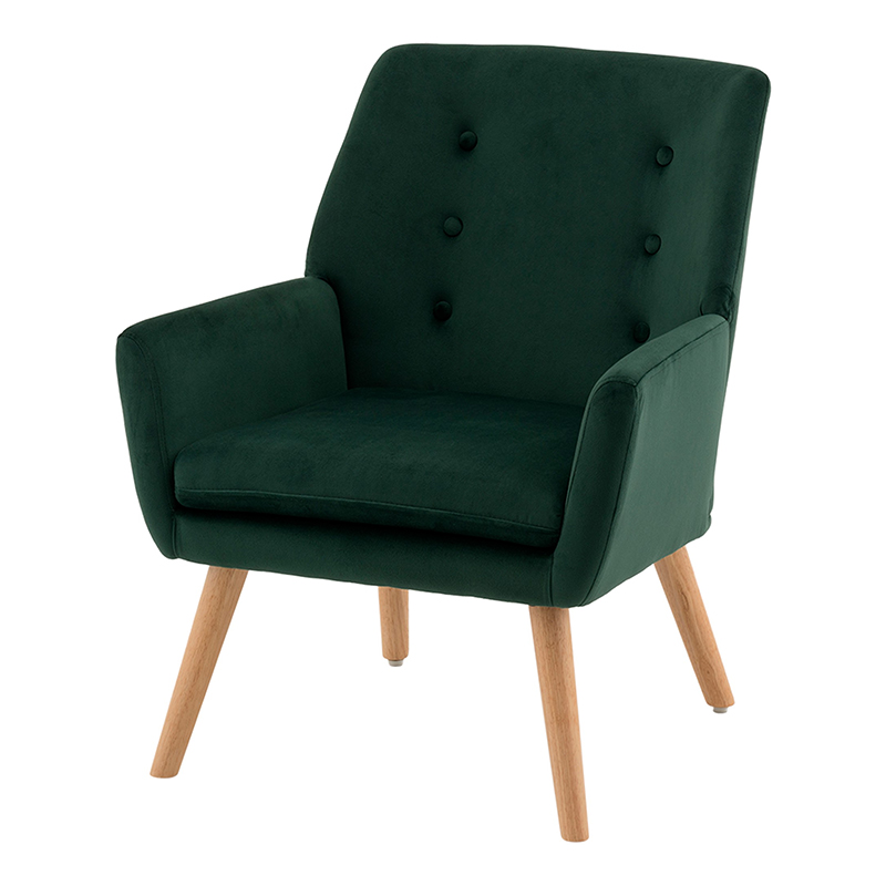 Обивка выполнена из прочного и приятного на ощупь велюра, который легко очищается и сохраняет насыщенность цвета. Ножки — из массива гевеи, окрашены в натуральный оттенок светлого дерева. Конструкция выдерживает до 120 кг.