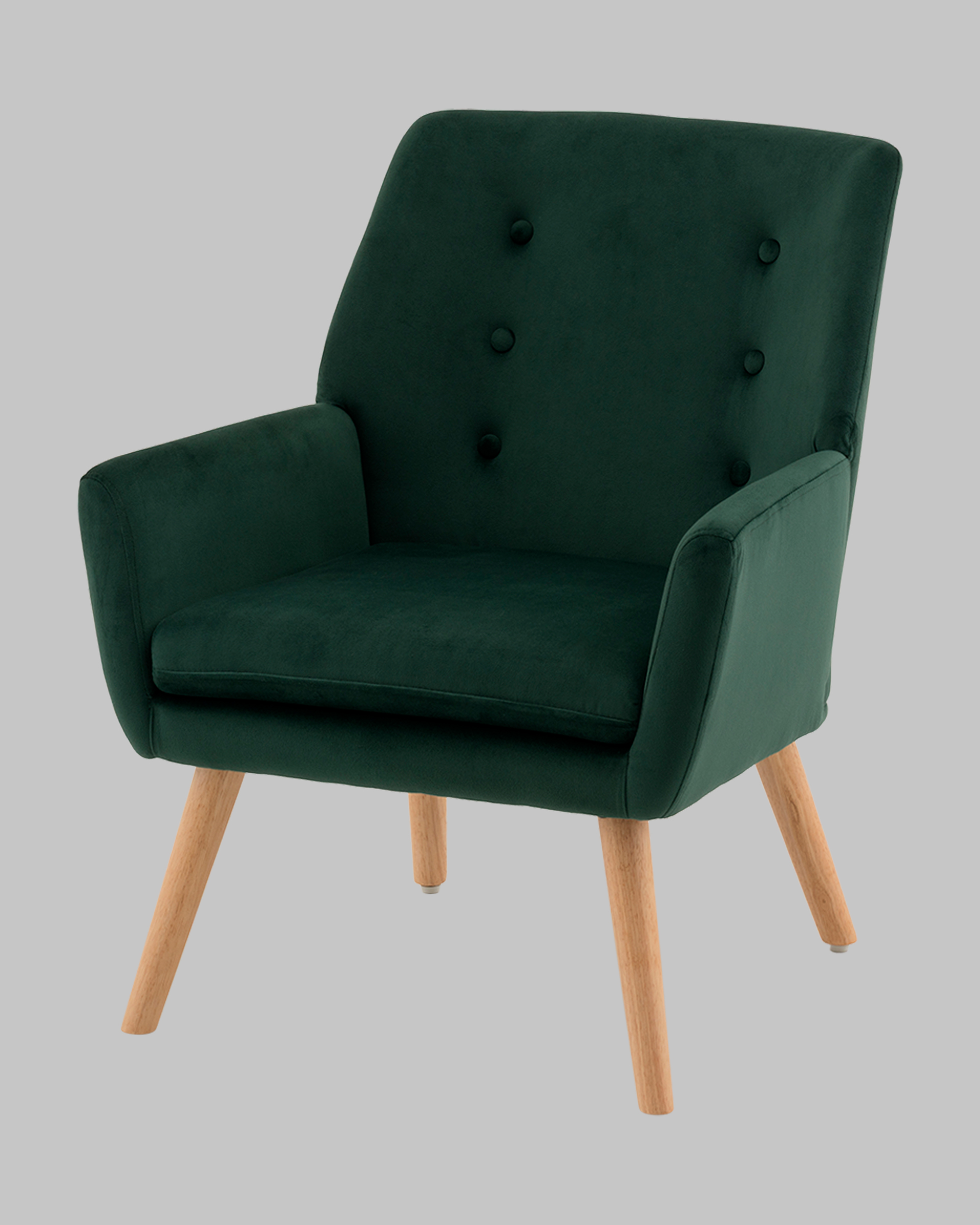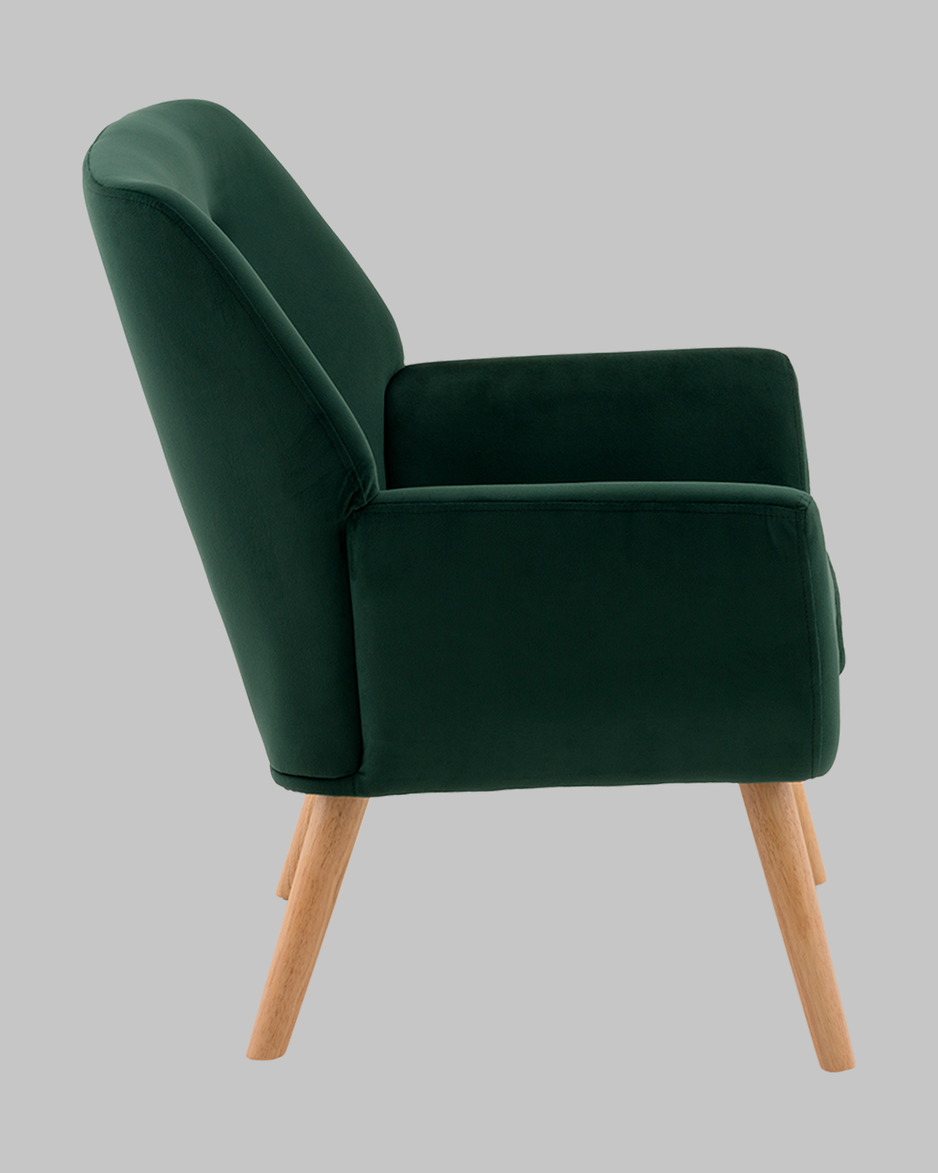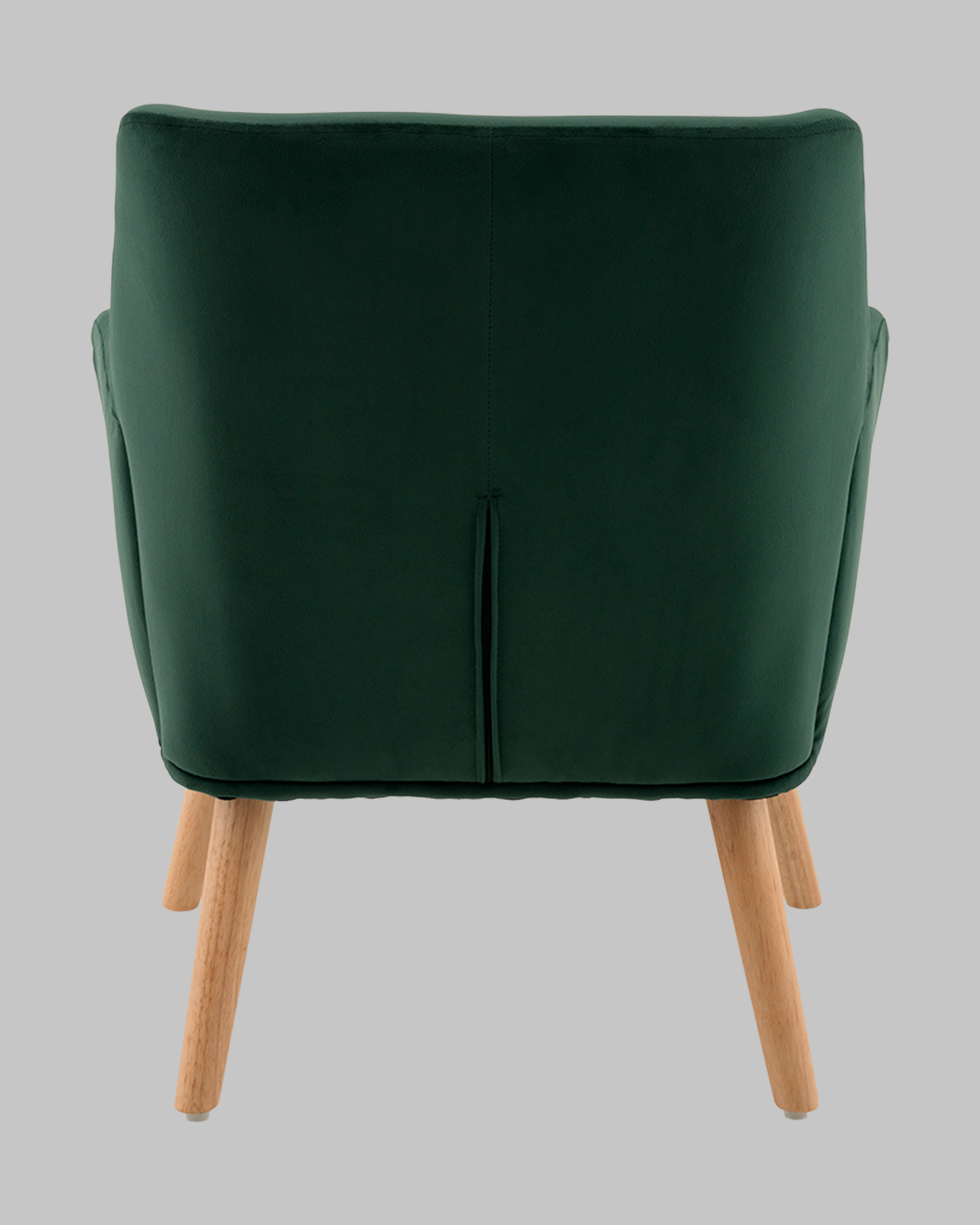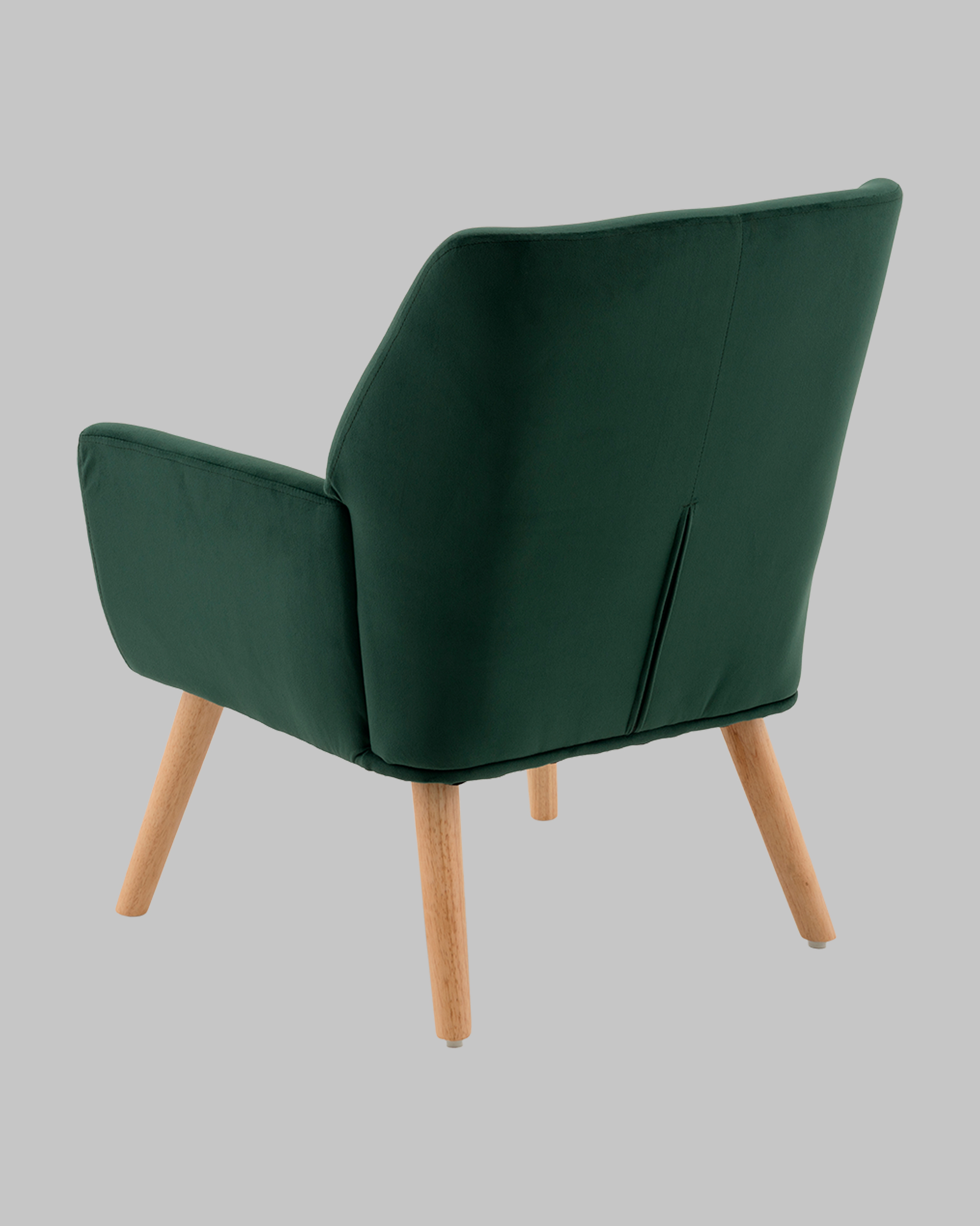 Обивка выполнена из прочного и приятного на ощупь велюра, который легко очищается и сохраняет насыщенность цвета. Ножки — из массива гевеи, окрашены в натуральный оттенок светлого дерева. Конструкция выдерживает до 120 кг.