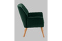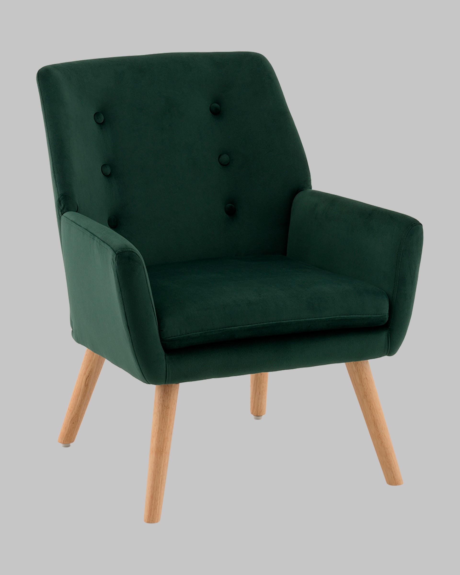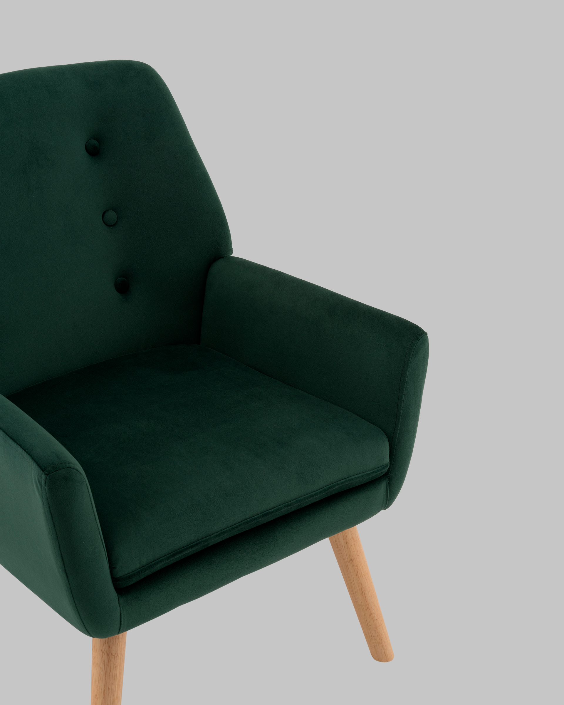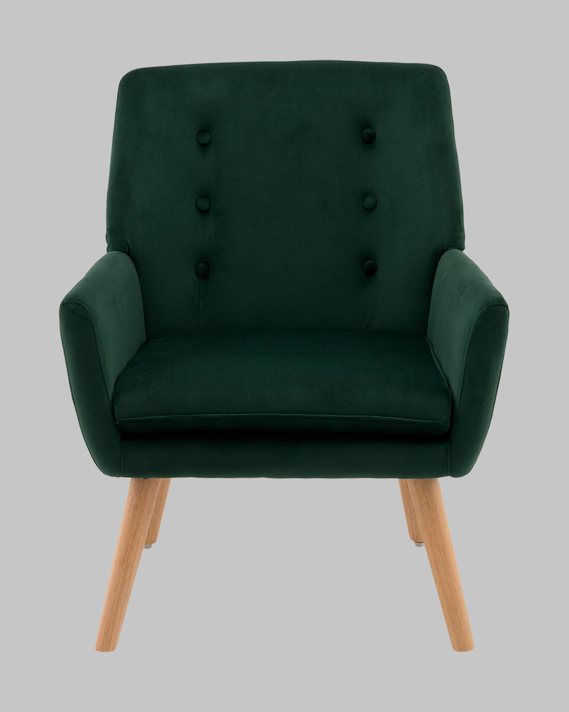Обивка выполнена из прочного и приятного на ощупь велюра, который легко очищается и сохраняет насыщенность цвета. Ножки — из массива гевеи, окрашены в натуральный оттенок светлого дерева. Конструкция выдерживает до 120 кг.