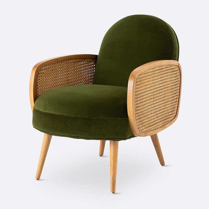 "Для создания Buisseau я хотел переосмыслить культовую эстетику 50-х годов, сочетая подлокотники в форме крыльев самолета, короткую спинку, упругое сиденье и конические ножки. Компактный и яркий, он сочетает в себе теплоту велюра, мягкость массива дуба и изящество плетения. Все изгибы и округлости приглашают вас сделать только одну вещь: отдохнуть."