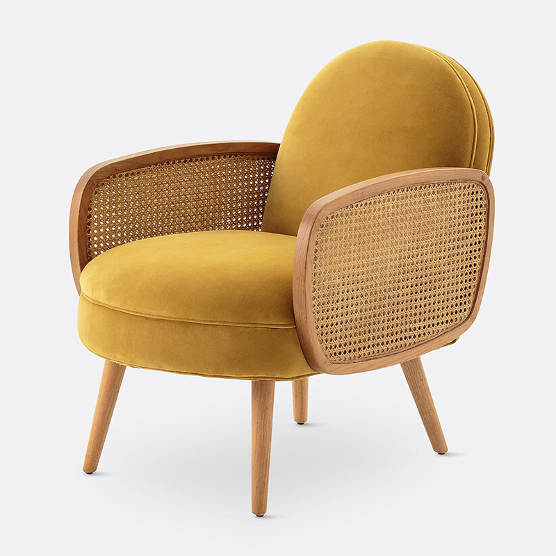 "Для создания Buisseau я хотел переосмыслить культовую эстетику 50-х годов, сочетая подлокотники в форме крыльев самолета, короткую спинку, упругое сиденье и конические ножки. Компактный и яркий, он сочетает в себе теплоту велюра, мягкость массива дуба и изящество плетения. Все изгибы и округлости приглашают вас сделать только одну вещь: отдохнуть."