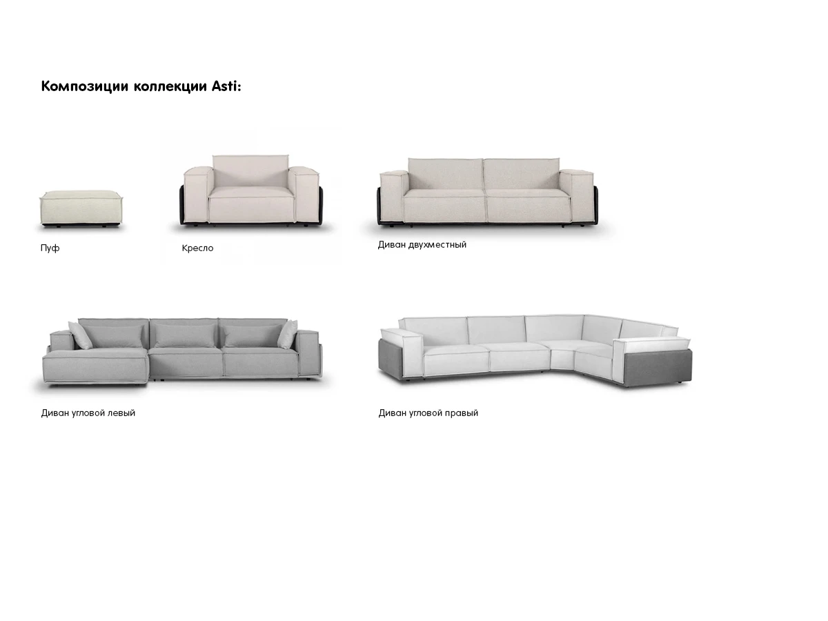 Диваны имеют функцию раскладывания. Характеризуются большой вместимостью, упругой, в меру мягкой, поверхностью. Благодаря конструкции диван можно разместить у стены, в углу комнаты или в центре. Можно выбрать цвет и фактуру обивки, которая будет соответствовать вашим индивидуальным предпочтениям. Устойчивая и функциональная мягкая группа Asti выведет любое пространство на новый уровень комфорта.