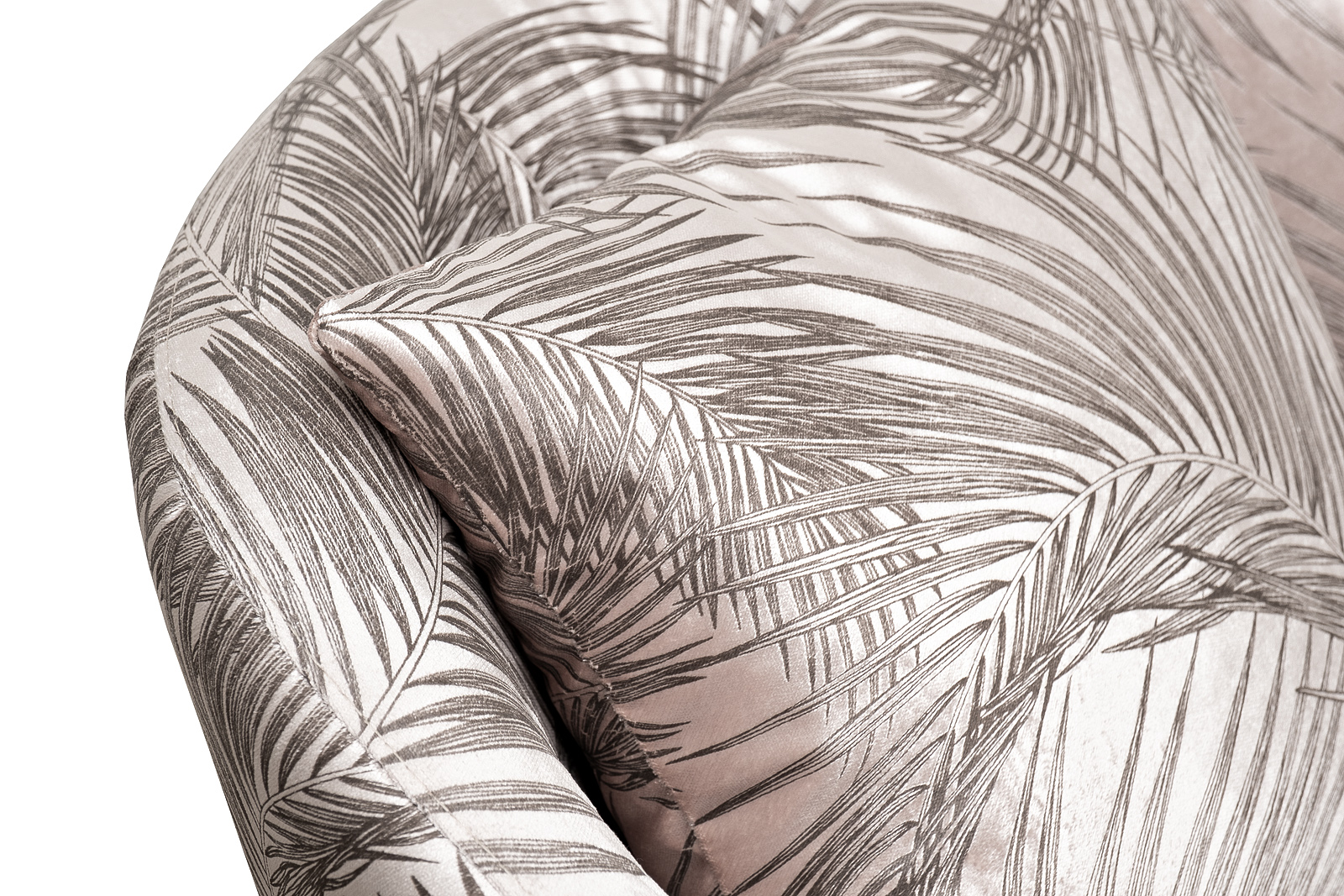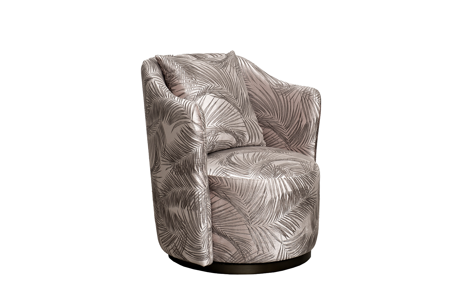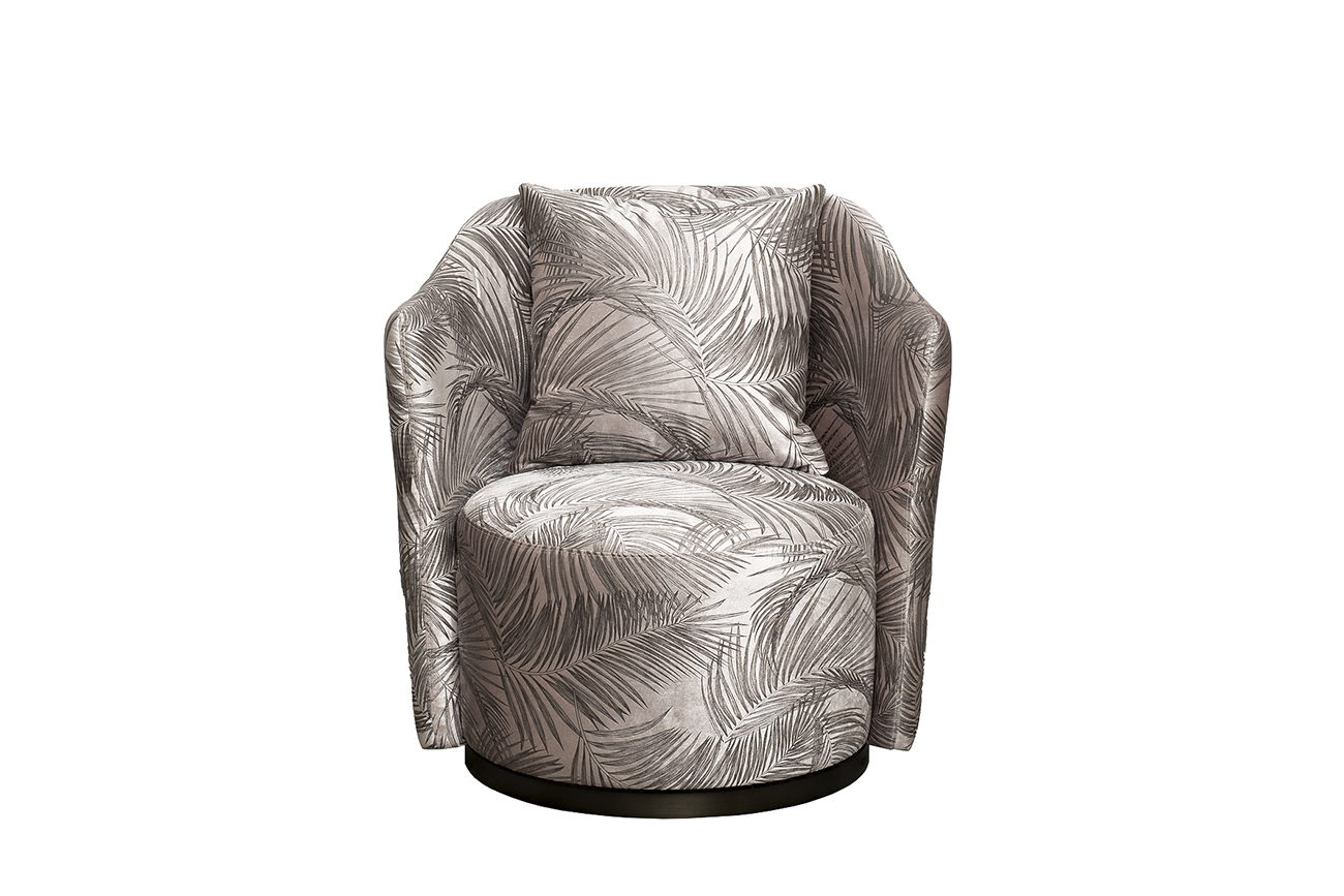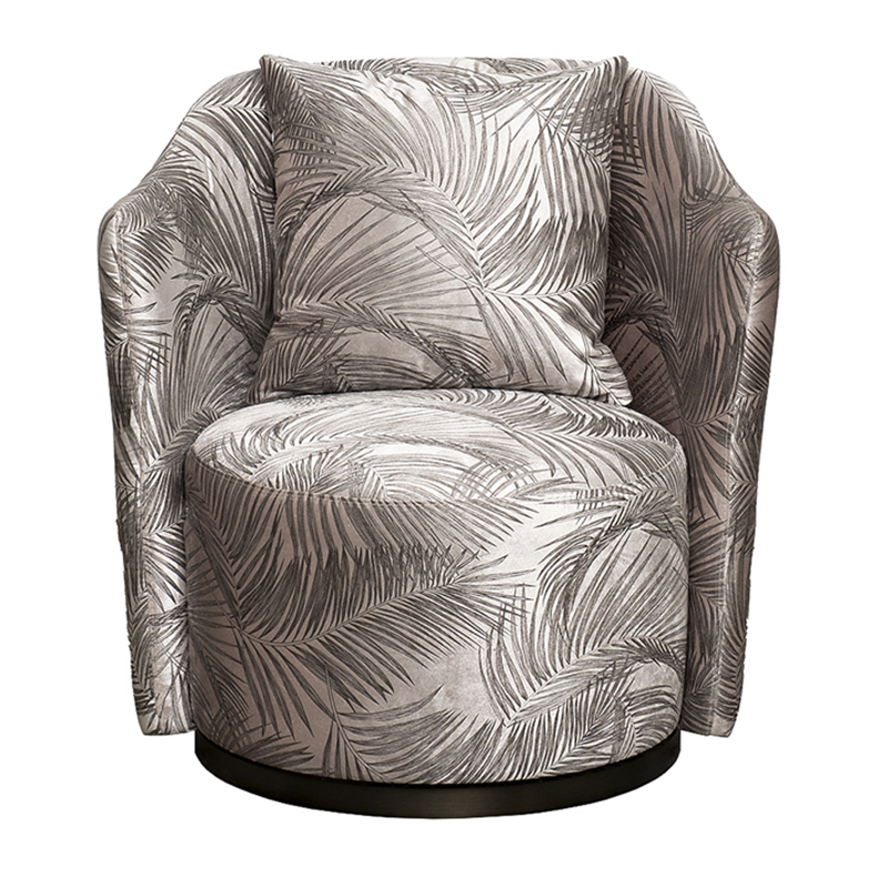 Запросить индивидуальное предложениеКрасивое вращающееся кресло VERONA идеально подойдет для современного интерьера, в котором важную роль играет эксклюзивность и высокое качество мебели. За счет надежного механизма сидение легко вращается, делая кресло мобильным и удобным как для отдыха, так и для работы. Классическая эргономичная форма, спинка с подлокотниками, мягкая подушка делает дизайнерское кресло с принтом «пальмовые листья» отличным выбором для гостиной, спальни, холла. Оно будет эффектно смотреться в жилых интерьерах ар-деко, неоклассика, фьюжн, шебби-шик, контемпорари. Размер сиденья Г58*Ш60*В40см.Диаметр металлической части основания - 58см, высота - 3,5см. В стандартном исполнении: обивка - ткань вельвет из коллекции Garda Decor с дизайнерским принтом листья Valdes110-BEG, металлическое основание, цвет бронза.