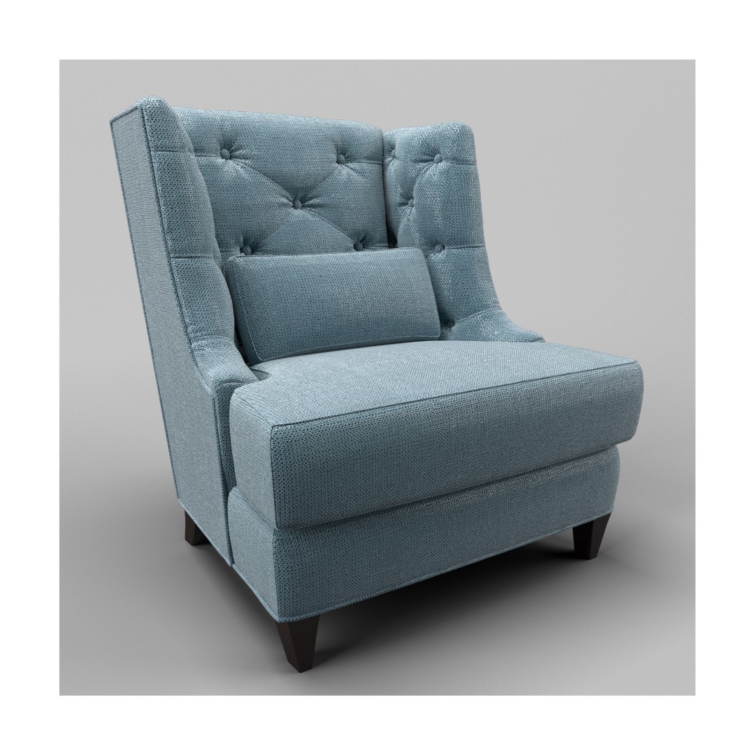 На фото с пуфом FB.ST.MES.33. Пуф в стоимость не входит. Кресло выполнено в стиле Неоклассика. Обито тканью серо-голубая рогожка, спинка и внутренняя часть боковинок декорированы стежкой капитоне. Ножки в отделке шпон махагона Mahogany B. Каркас сделан из массива дерева.