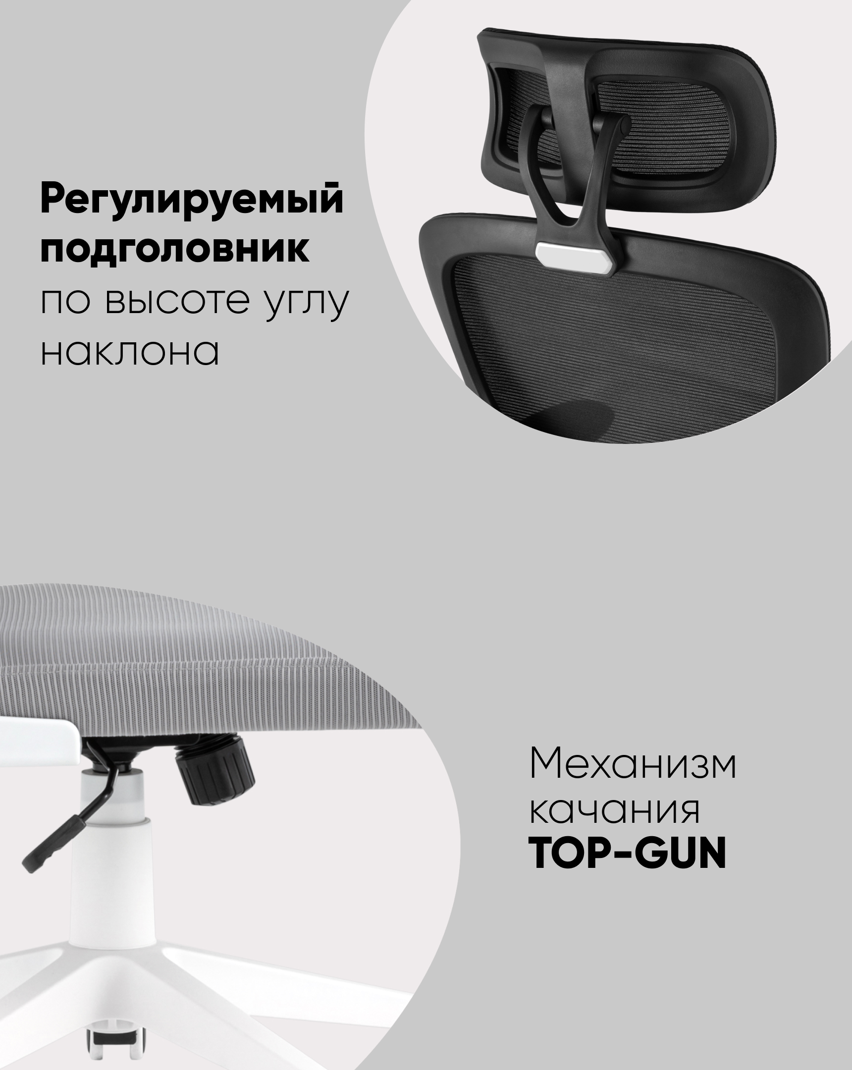 Удобное положение легко выбрать благодаря механизму регулировки высоты и качания Top Gun. Подлокотники регулируются по высоте, а мягкие накладки обеспечивают максимальный комфорт. Регулируемый подголовник настраивается по высоте и углу наклона.