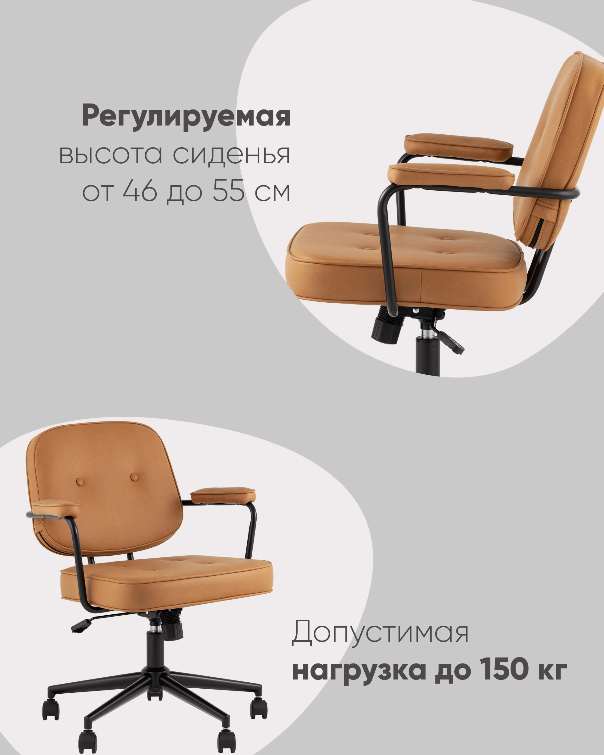 Удобная спинка оказывает качественную поддержку и позволяет провести в кресле долгое время без усталости. Каркас изготовлен из металла в черном цвете и позволяет выдержать нагрузку до 150 кг.