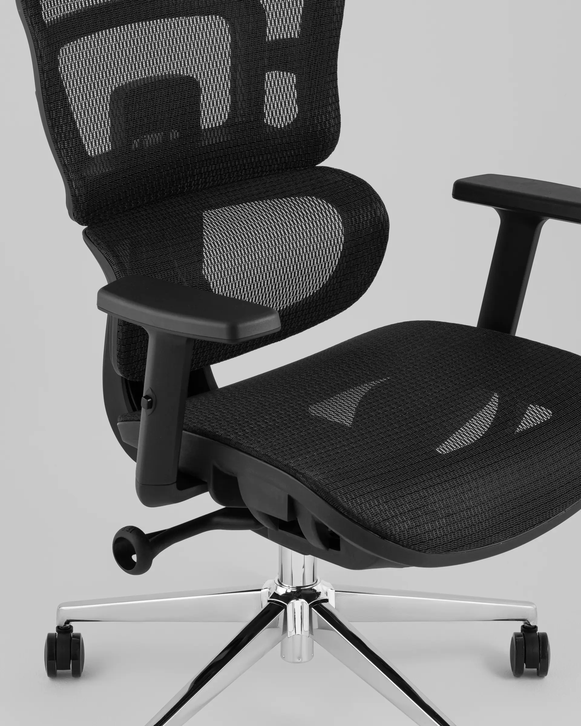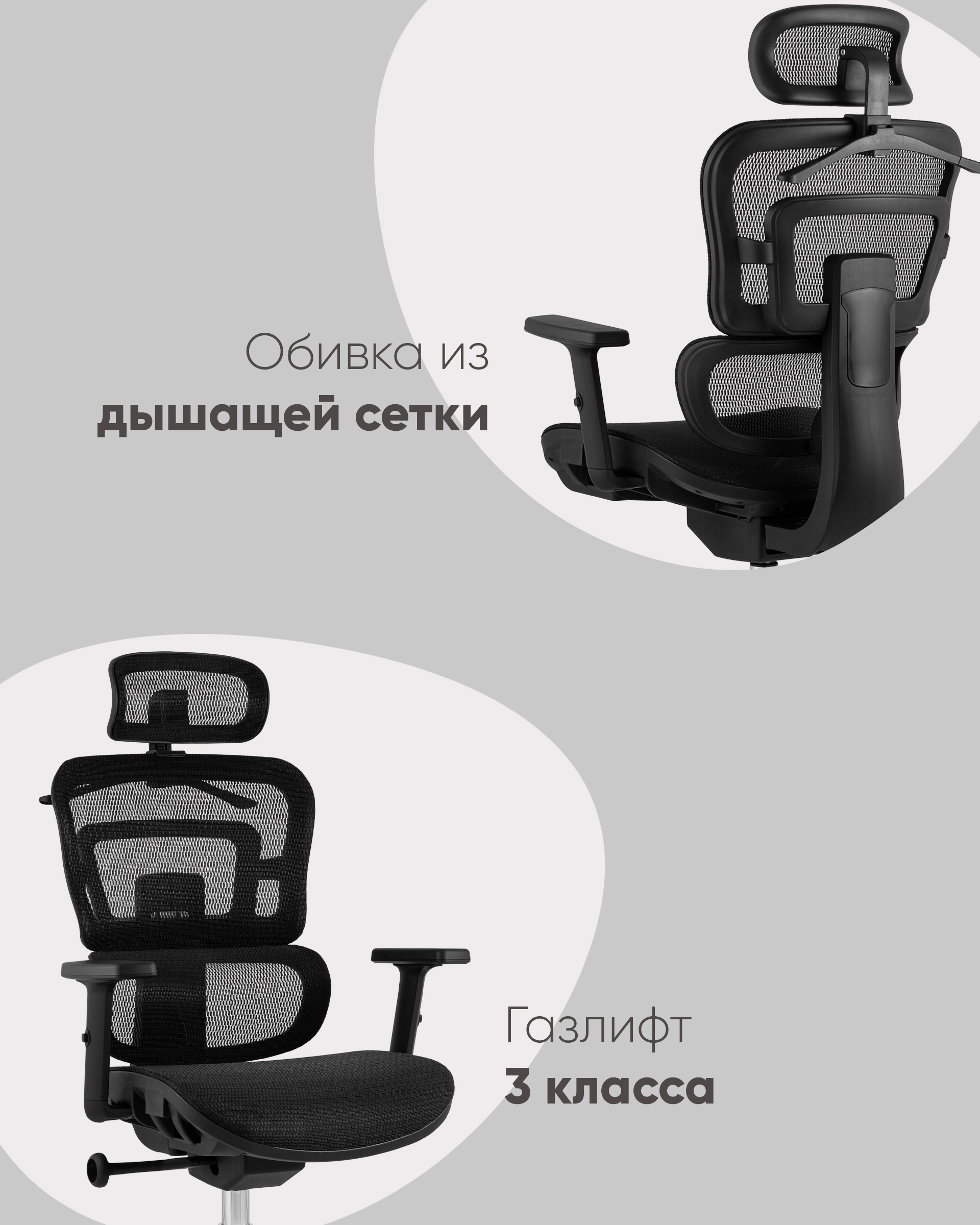 Эргономика и дизайн. Элегантный современный дизайн кресла включает эргономичную спинку с поддержкой поясницы. Регулируемый подголовник и подлокотники (тип 1D) позволяют настроить кресло под индивидуальные потребности. Просторное сиденье шириной 56 см дополнено механизмом "мультиблок", обеспечивающим регулировку наклона и качания.