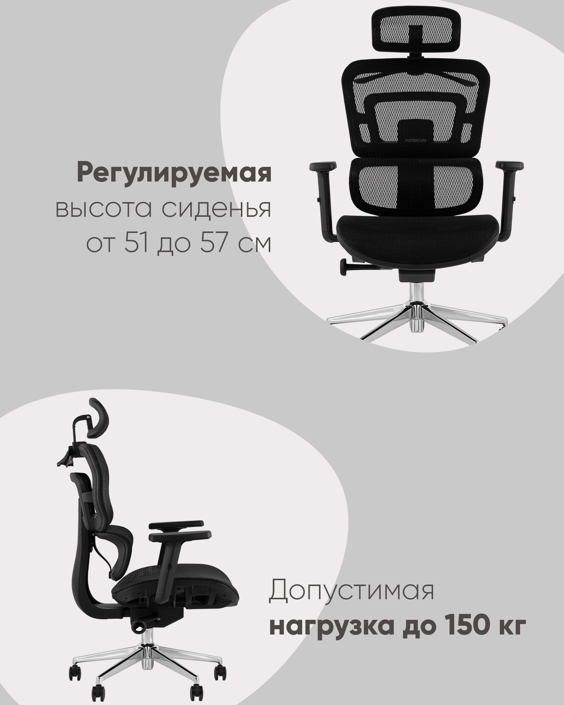 Материалы и прочность. Кресло выполнено с обивкой из дышащей сетки, которая обеспечивает вентиляцию и комфорт даже при длительном использовании. Каркас и ножки изготовлены из хромированного металла, что гарантирует долговечность и устойчивость. Максимальная нагрузка — 150 кг.