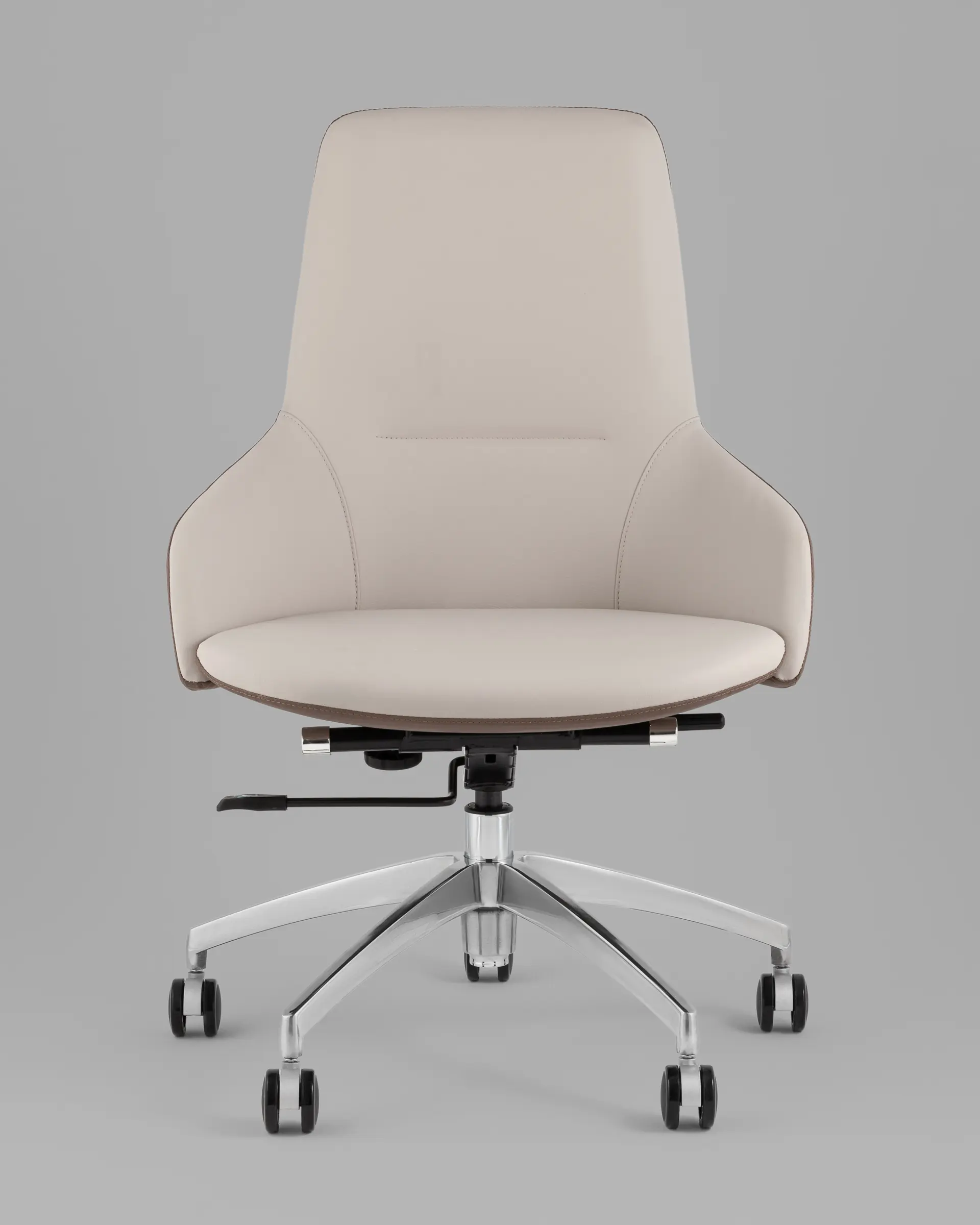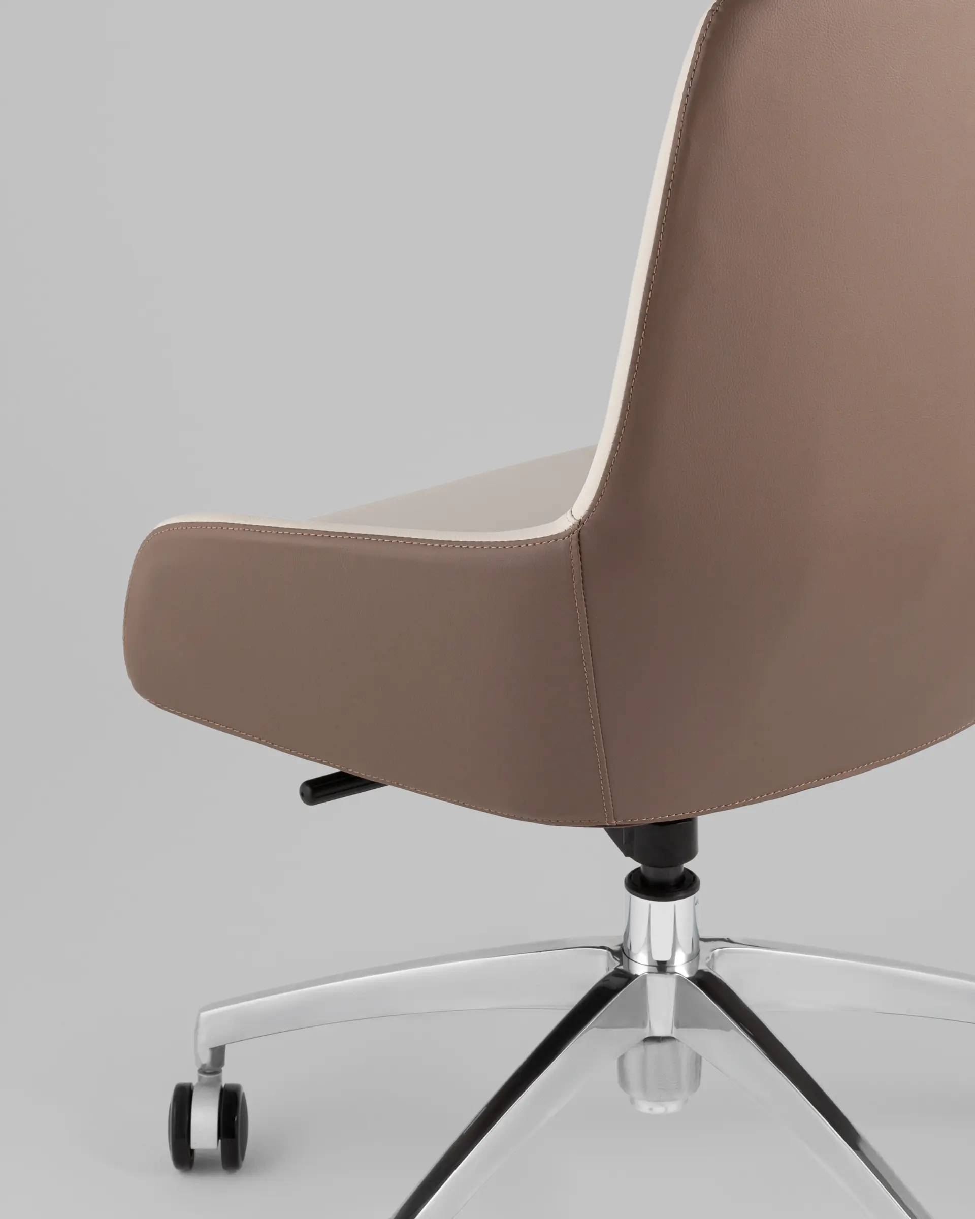 Материалы и цвета. Кресло обтянуто прочной светло-серой экокожей, которая приятна на ощупь и легко чистится. Задняя часть спинки выполнена в контрастном коричневом оттенке, что придает модели современный и стильный вид. Крестовина из алюминия обеспечивает устойчивость и долговечность, а ролики из полиуретана и нейлона позволяют легко и бесшумно перемещаться по любым покрытиям пола.