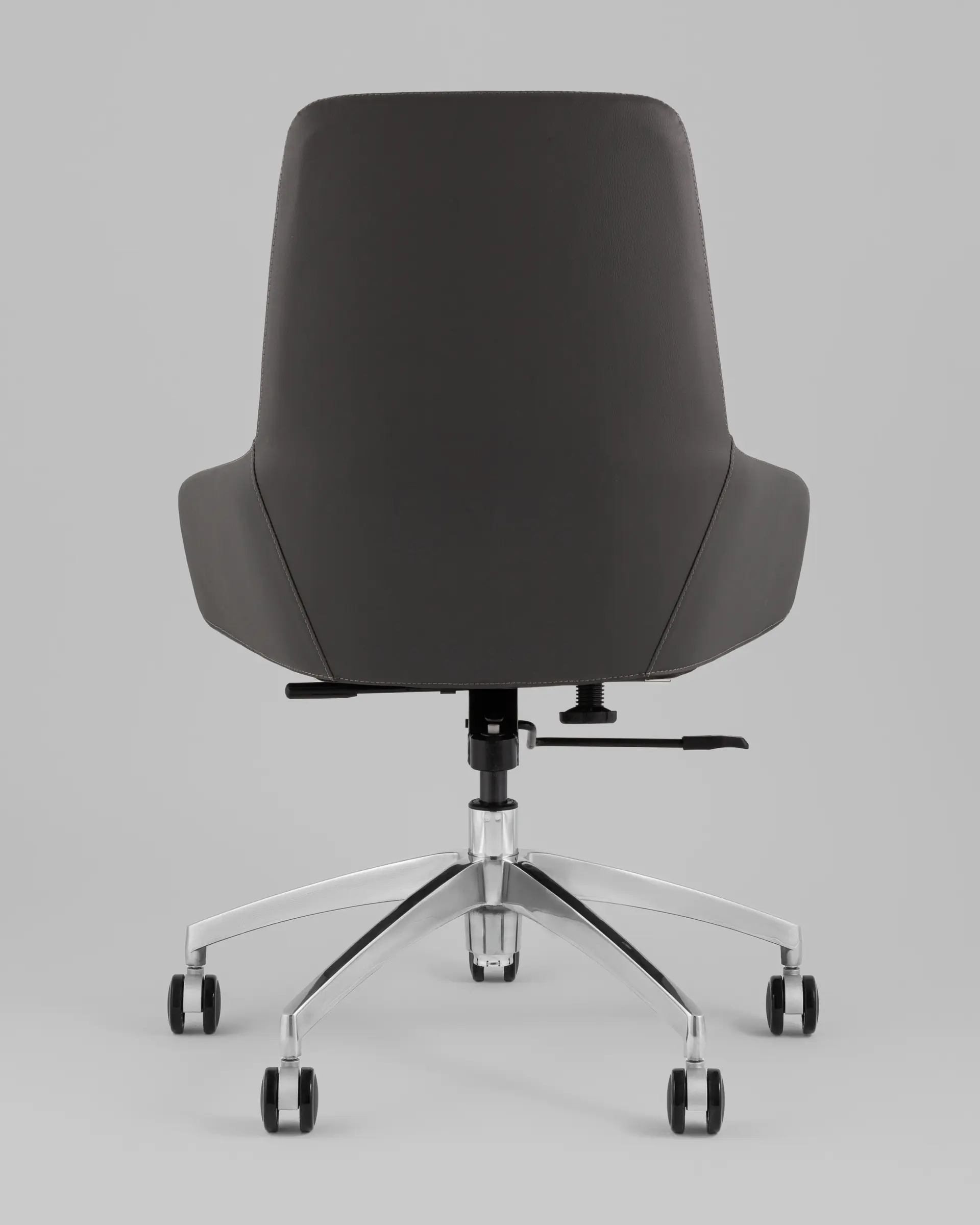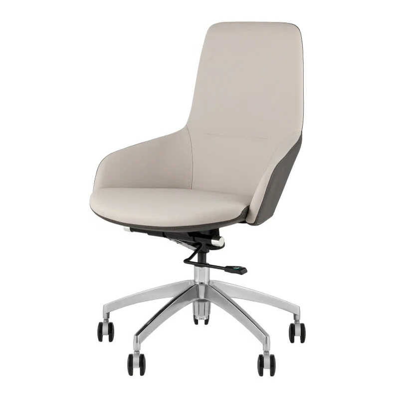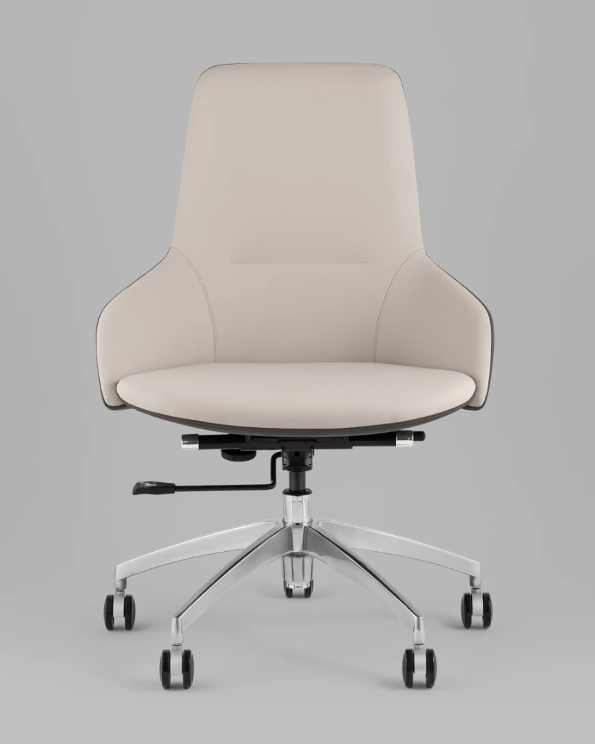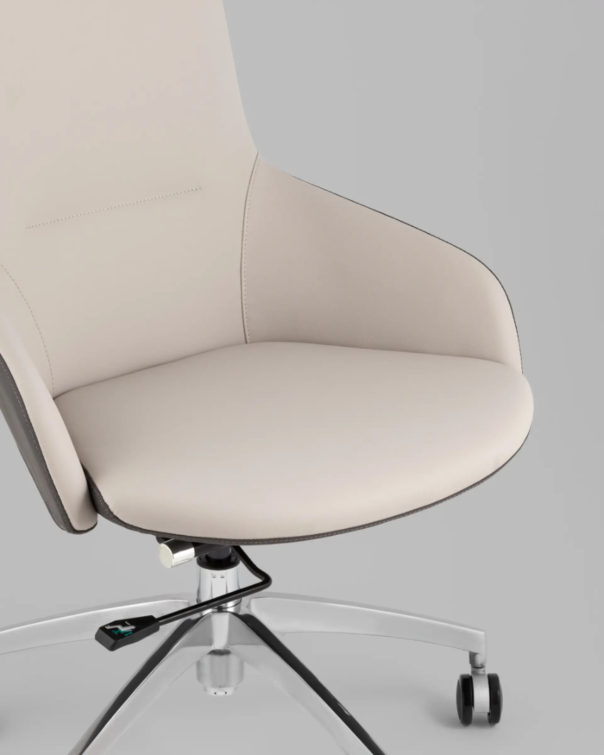 Материалы и цвета. Кресло обтянуто прочной светло-серой экокожей, которая приятна на ощупь и легко чистится. Задняя часть спинки выполнена в контрастном коричневом оттенке, что придает модели современный и стильный вид. Крестовина из алюминия обеспечивает устойчивость и долговечность, а ролики из полиуретана и нейлона позволяют легко и бесшумно перемещаться по любым покрытиям пола.