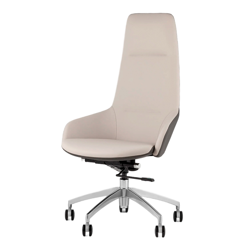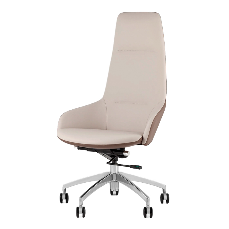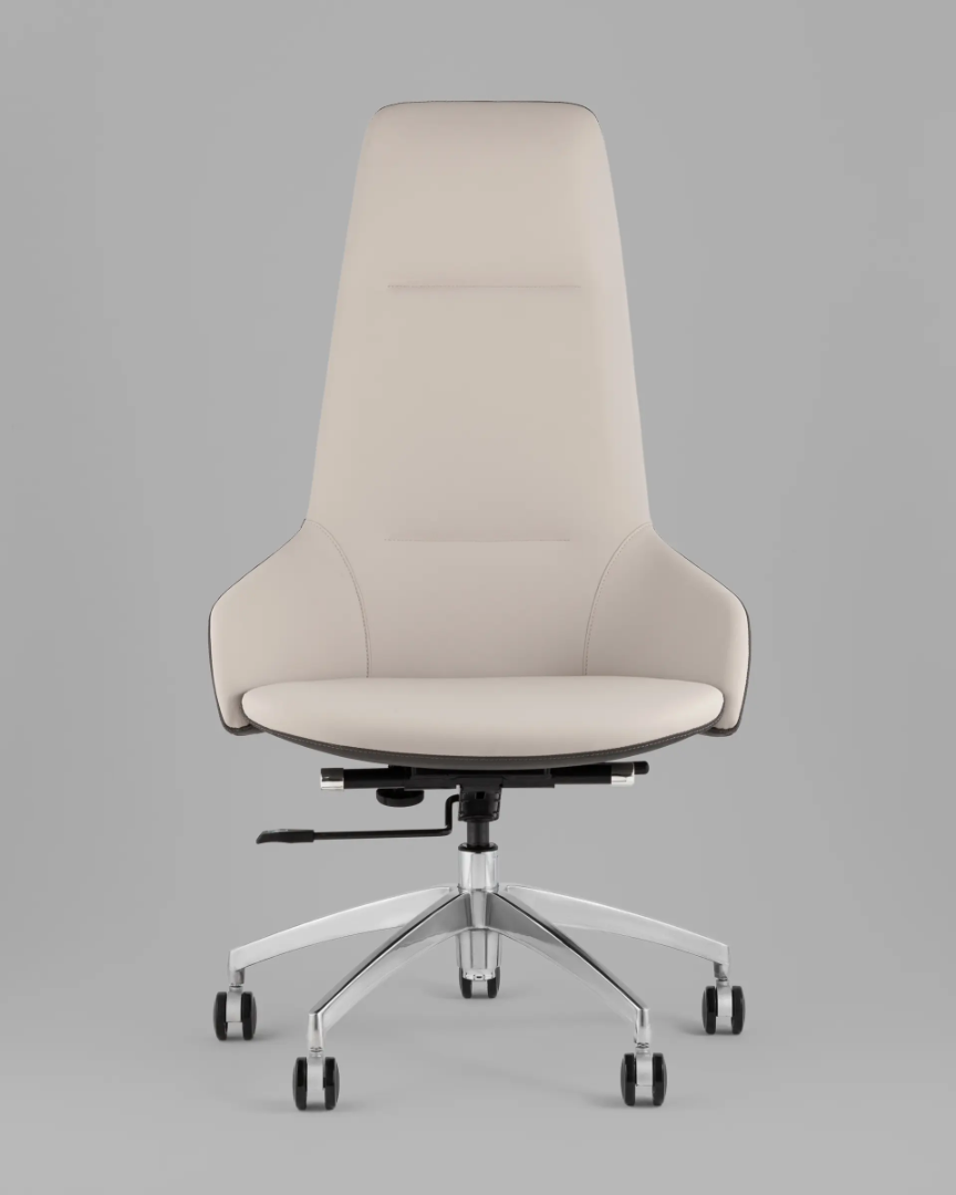 Материалы и цвета. Обивка выполнена из высококачественной светло-серой экокожи, которая добавляет модели стиль и практичность. Задняя часть спинки выделяется контрастным коричневым оттенком, подчеркивающим премиальный характер изделия. Крестовина из прочного алюминия обеспечивает надежную поддержку и современный внешний вид.