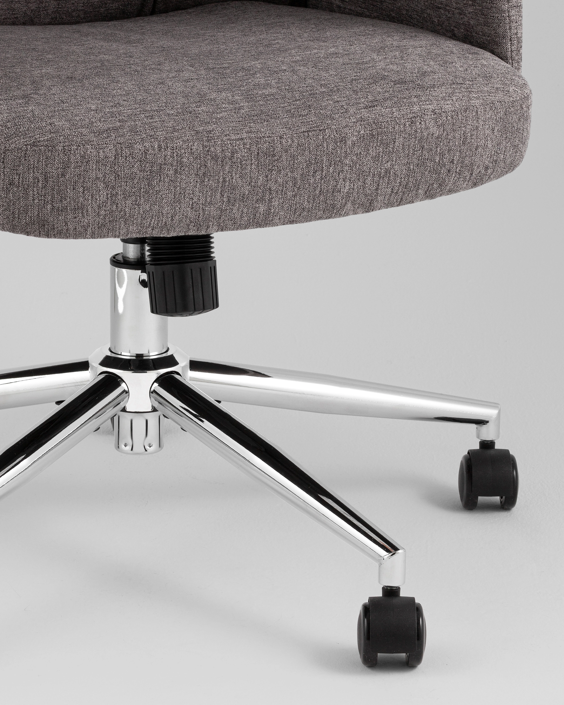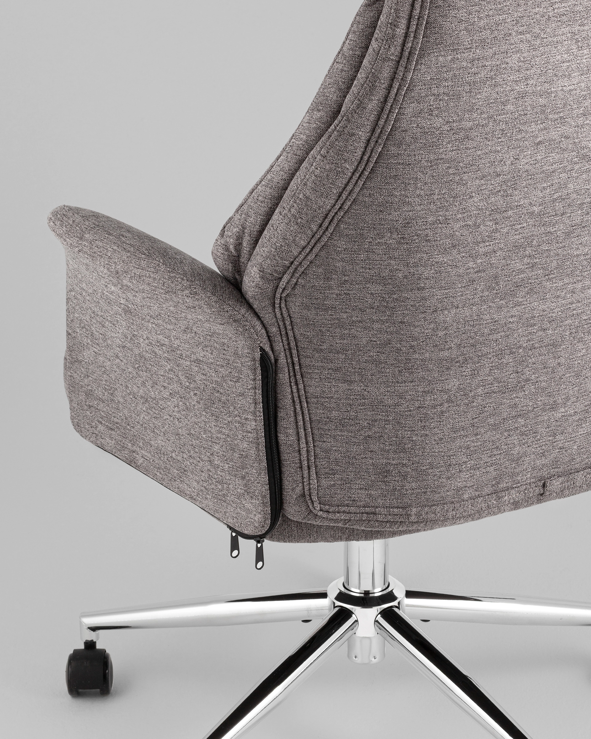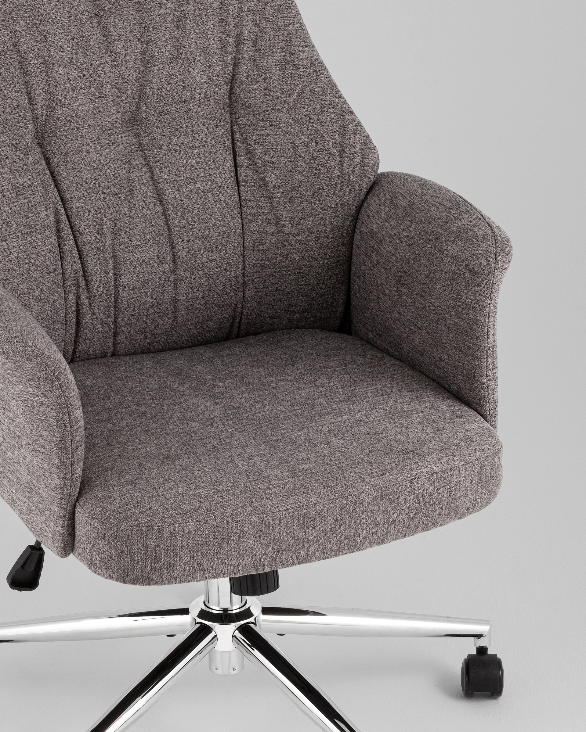 Плотная тканевая обивка устойчива к износу и приятна на ощупь. Металлическая крестовина обеспечивает прочность и устойчивость, а полиуретановые ролики позволяют легко перемещать кресло, не повреждая напольное покрытие.