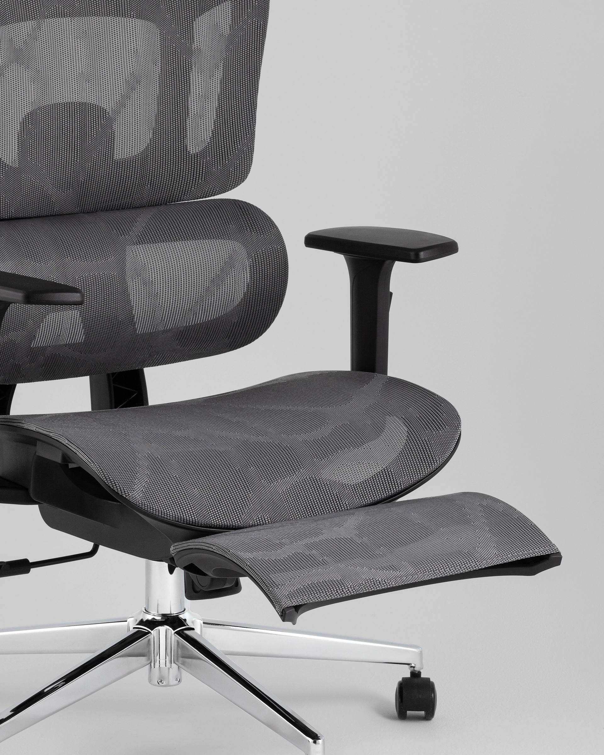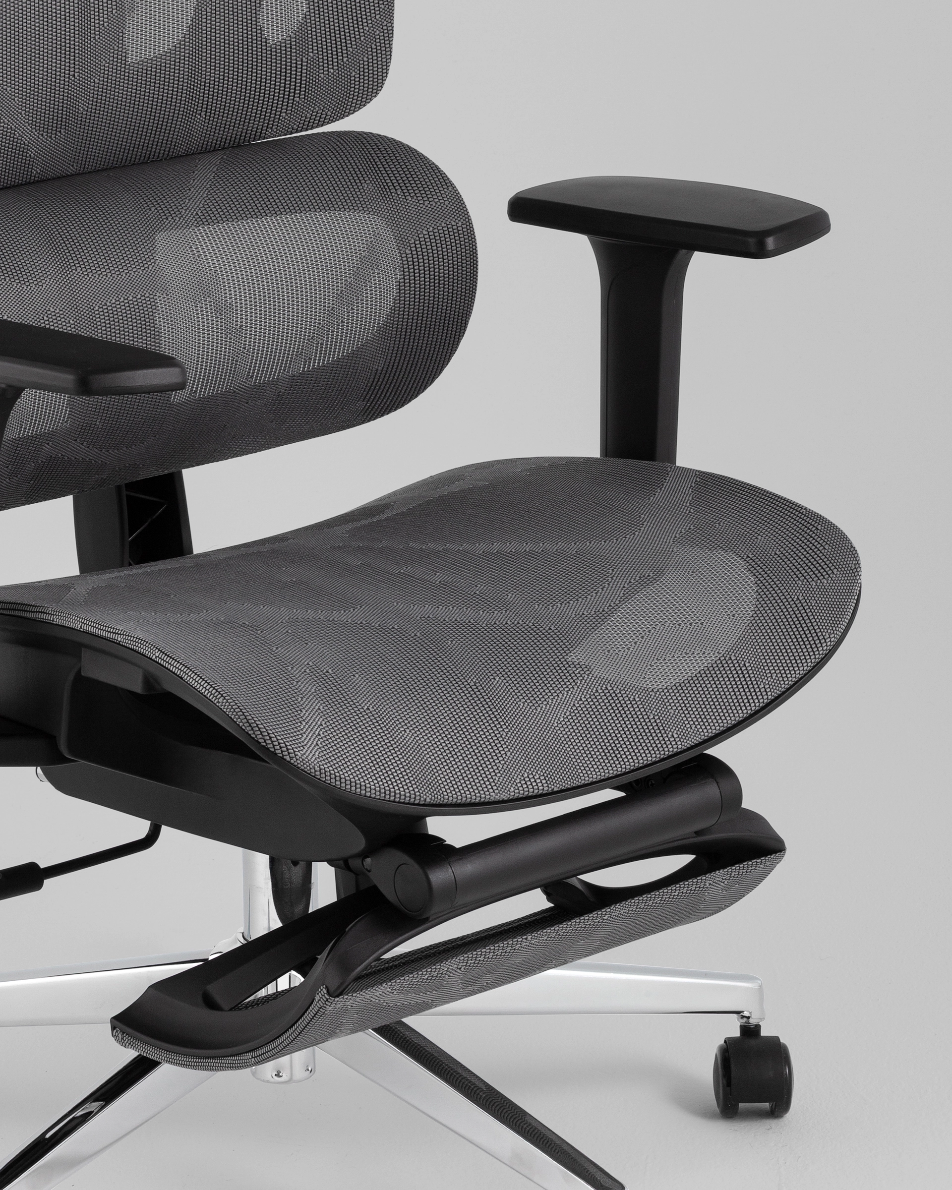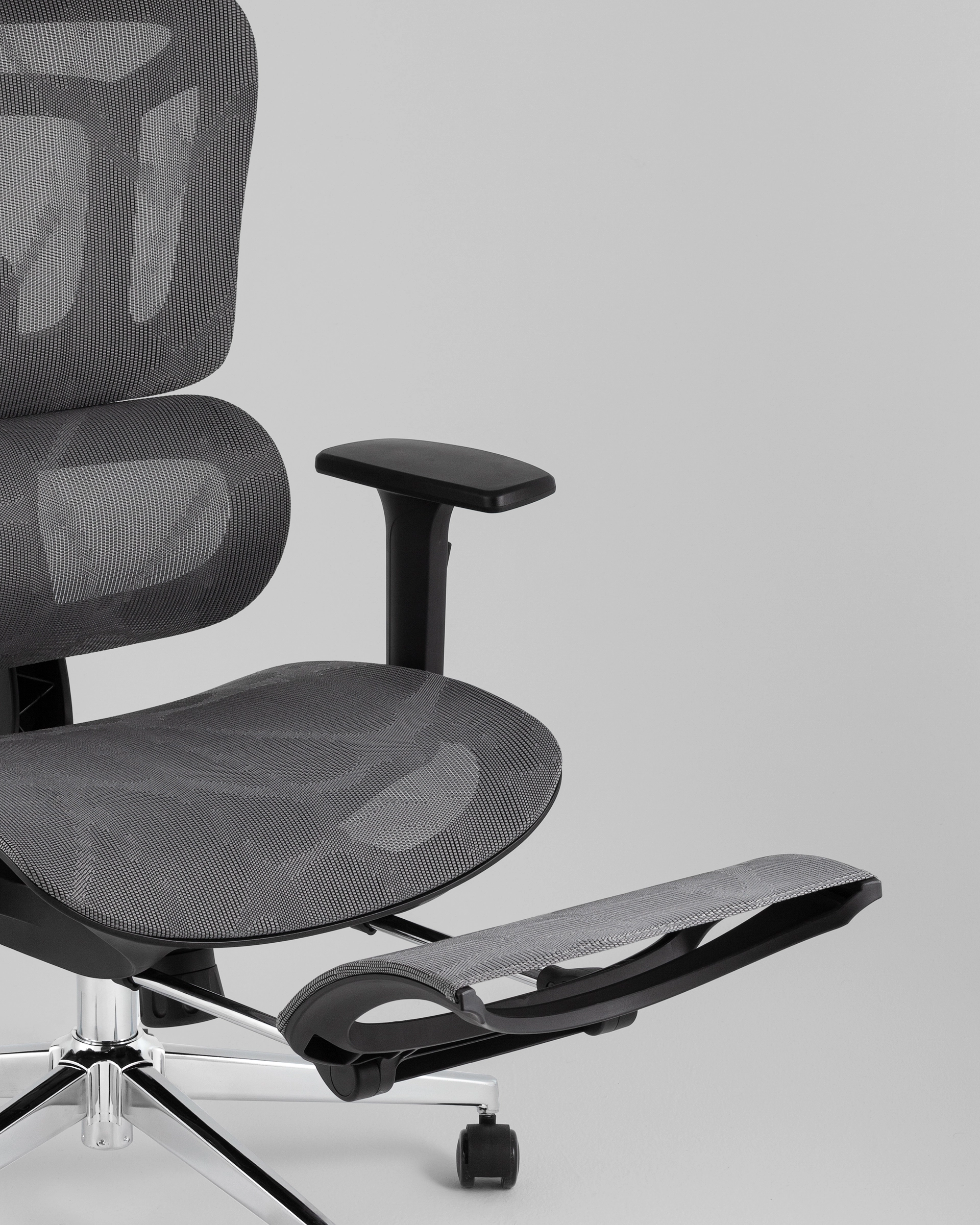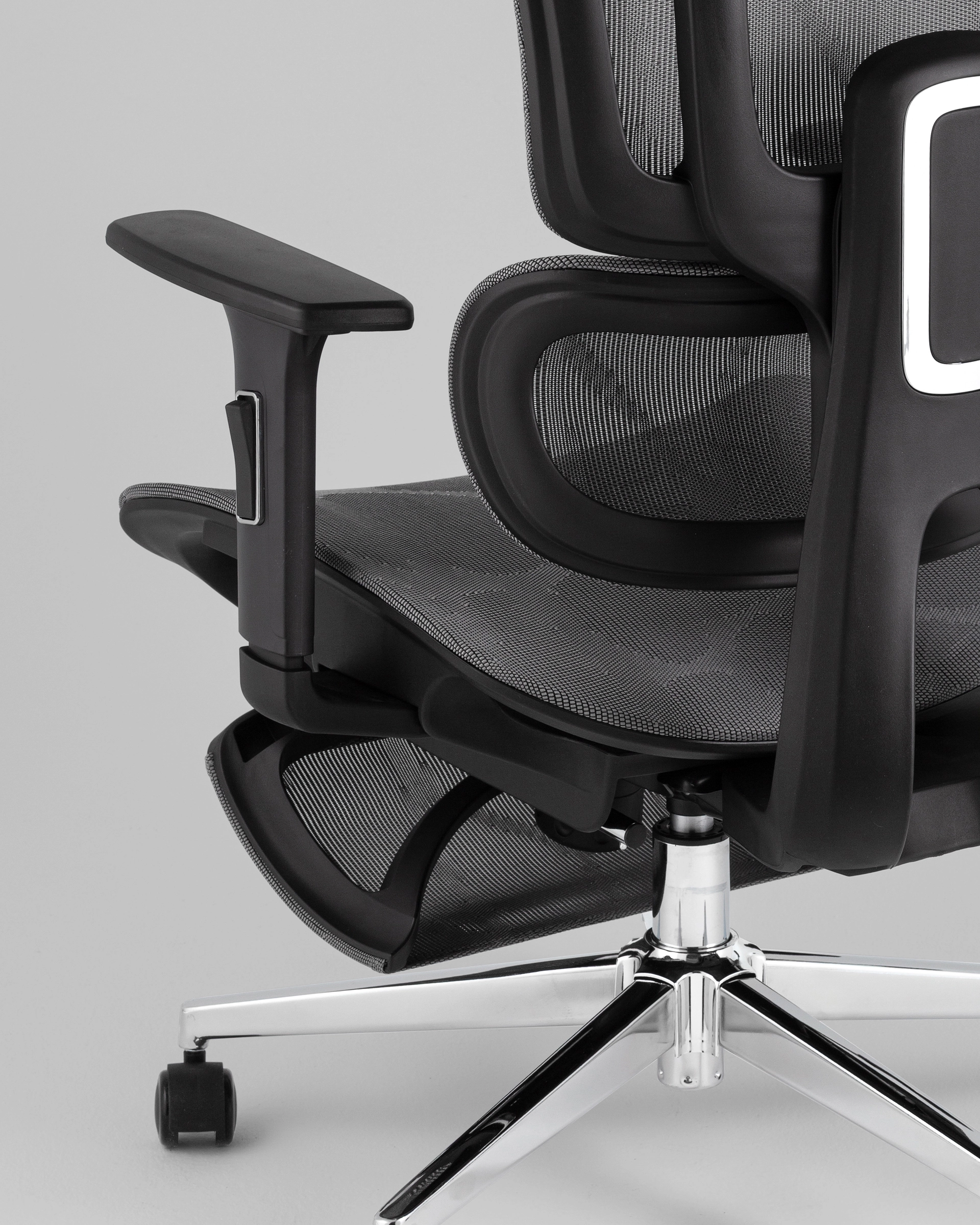 Кресло оснащено подголовником с возможностью регулировки, эргономичной высокой спинкой и 3D-подлокотниками — с изменением высоты, глубины и ширины. Благодаря синхромеханизму с мультиблоком можно зафиксировать удобное положение и обеспечить оптимальную поддержку спины. Газлифт 3 класса позволяет плавно регулировать высоту сиденья от 45 до 53 см. Встроенная выдвижная оттоманка обеспечивает дополнительный комфорт и позволяет удобно расположить ноги во время перерыва.