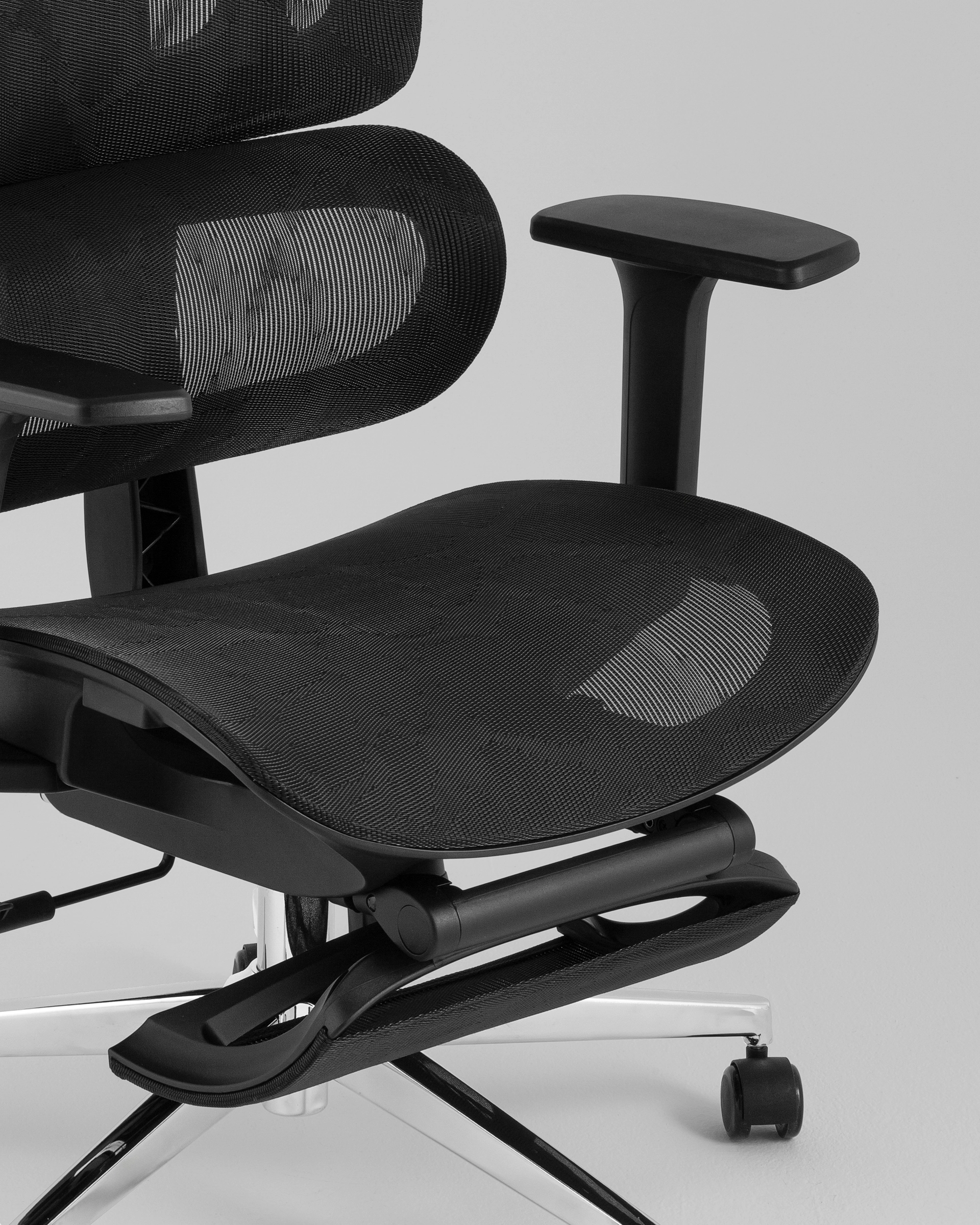Кресло оснащено подголовником с возможностью регулировки, эргономичной высокой спинкой и 3D-подлокотниками — с изменением высоты, глубины и ширины. Благодаря синхромеханизму с мультиблоком можно зафиксировать удобное положение и обеспечить оптимальную поддержку спины. Газлифт 3 класса позволяет плавно регулировать высоту сиденья от 45 до 53 см. Встроенная выдвижная оттоманка обеспечивает дополнительный комфорт и позволяет удобно расположить ноги во время перерыва.