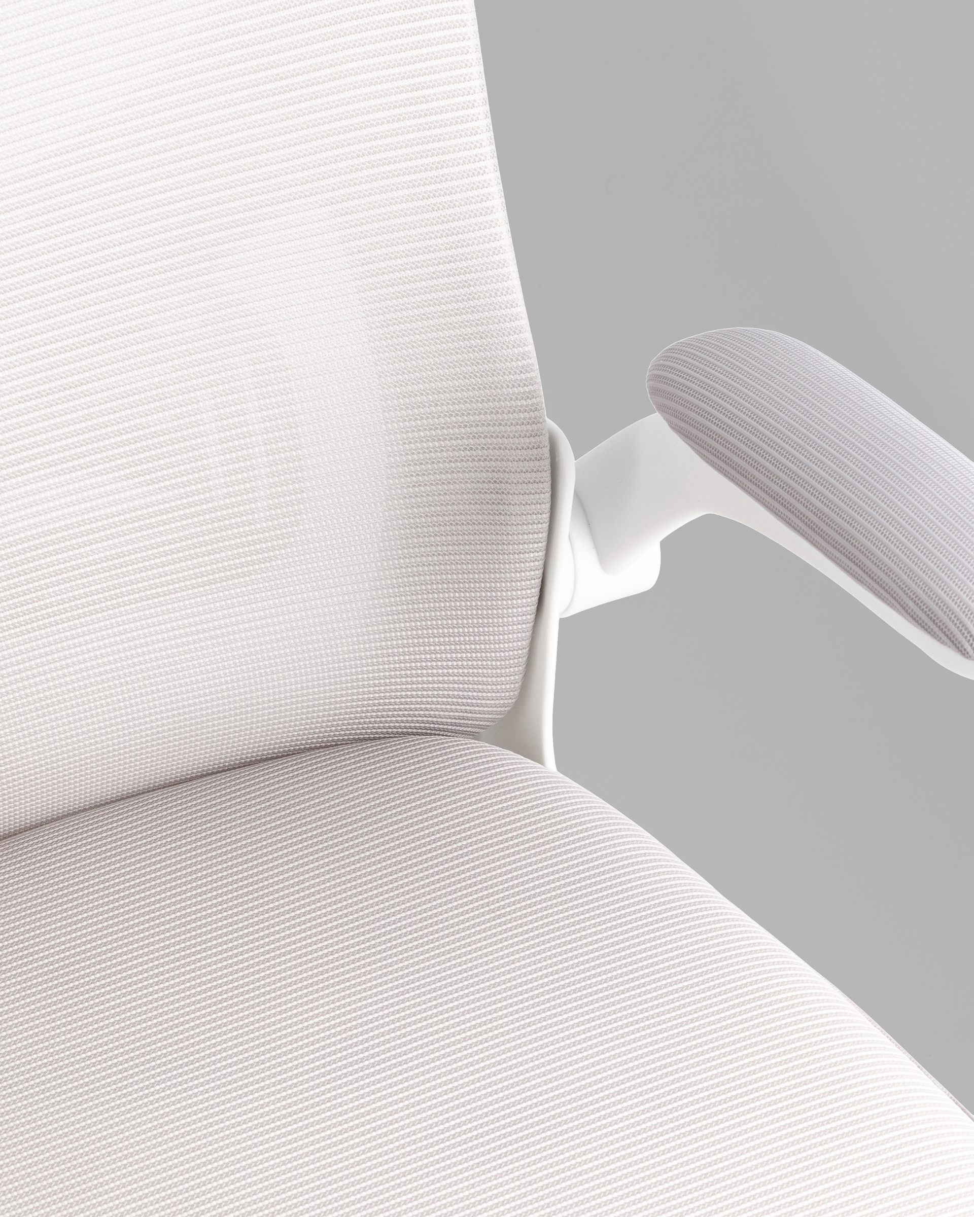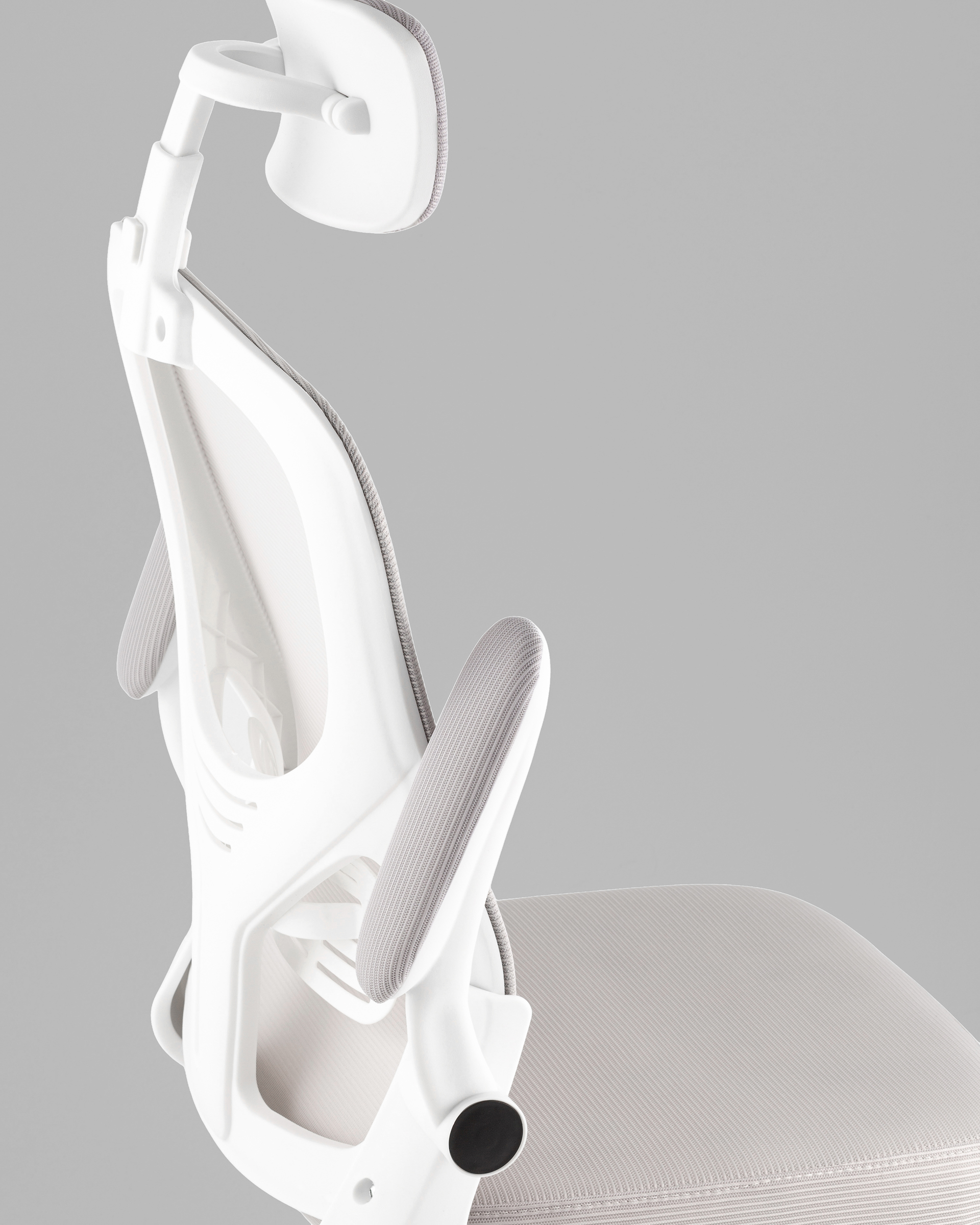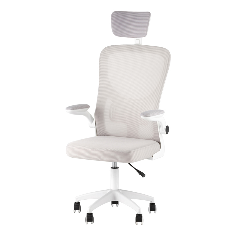 Светло-серый цвет обивки и белая база придают креслу легкий и современный вид, который гармонично впишется как в домашний кабинет, так и в деловую офисную среду. Компактная конструкция и мобильность делают кресло удобным и функциональным решением для любых рабочих задач.