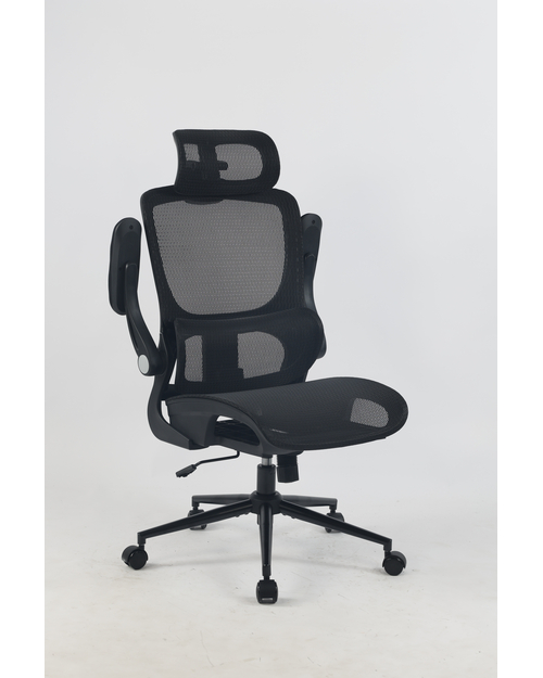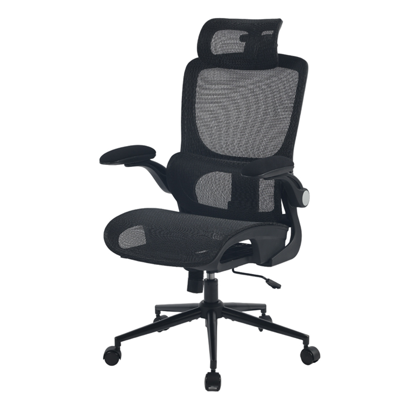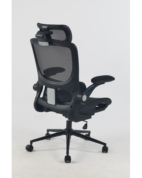Подлокотники откидываются, что позволяет удобно задвигать кресло под стол, экономя место. Также предусмотрена поясничная поддержка, важная для сохранения здоровья спины при длительной работе.
