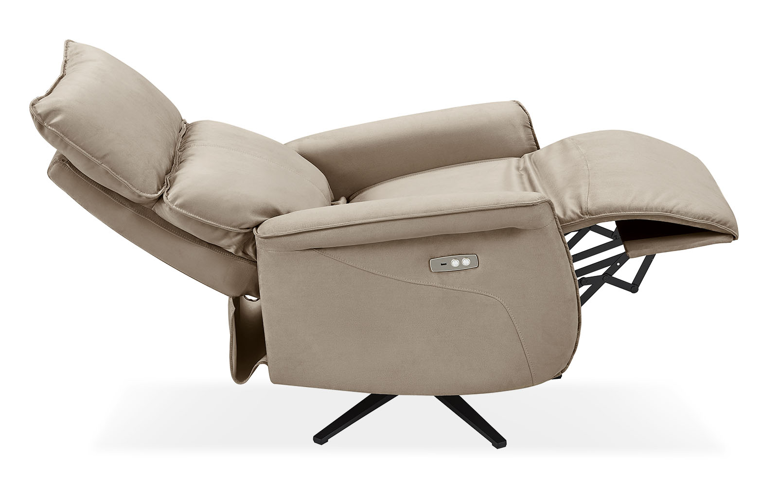 Кресло-реклайнер с электроприводом и функцией вращения. Управление с помощью кнопок на подлокотнике - первая кнопка раскладывает реклайнер, вторая кнопка отвечает за возвращение в исходное положение. . Оснащено встроенным USB зарядным устройством. Входное Напряжение – 100-240 В. Выходное напряжение AC/DC – 29 В; 2 А; Частота – 50-60 ГЦ.