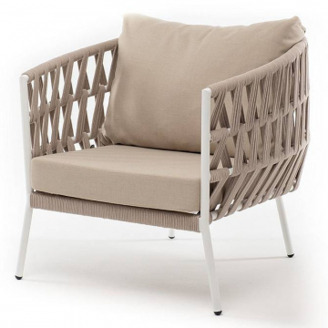 "Диего" кресло плетеное из роупа, каркас алюминий белый муар, роуп бежевый круглый, ткань бежевая 052