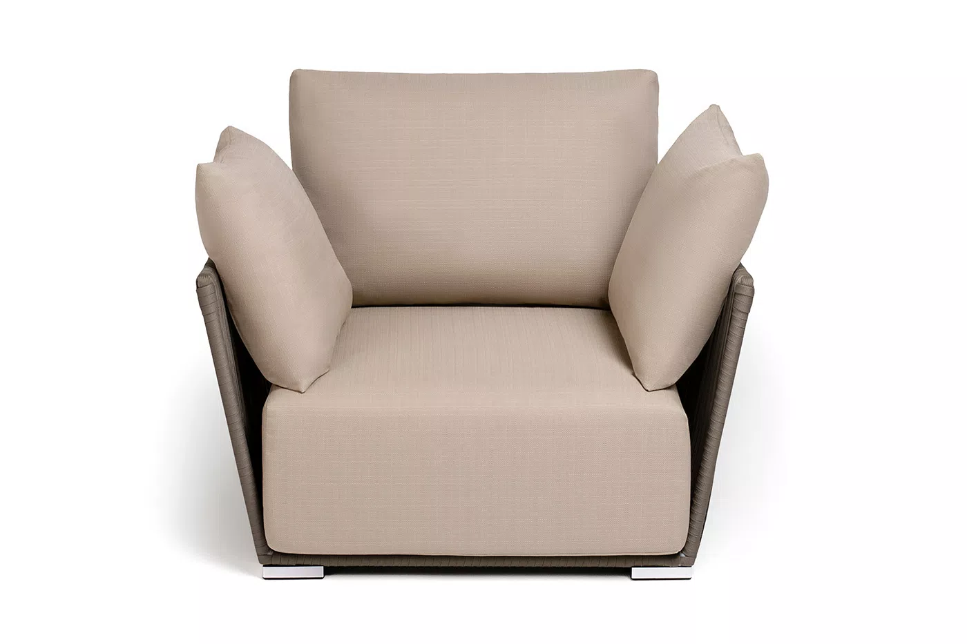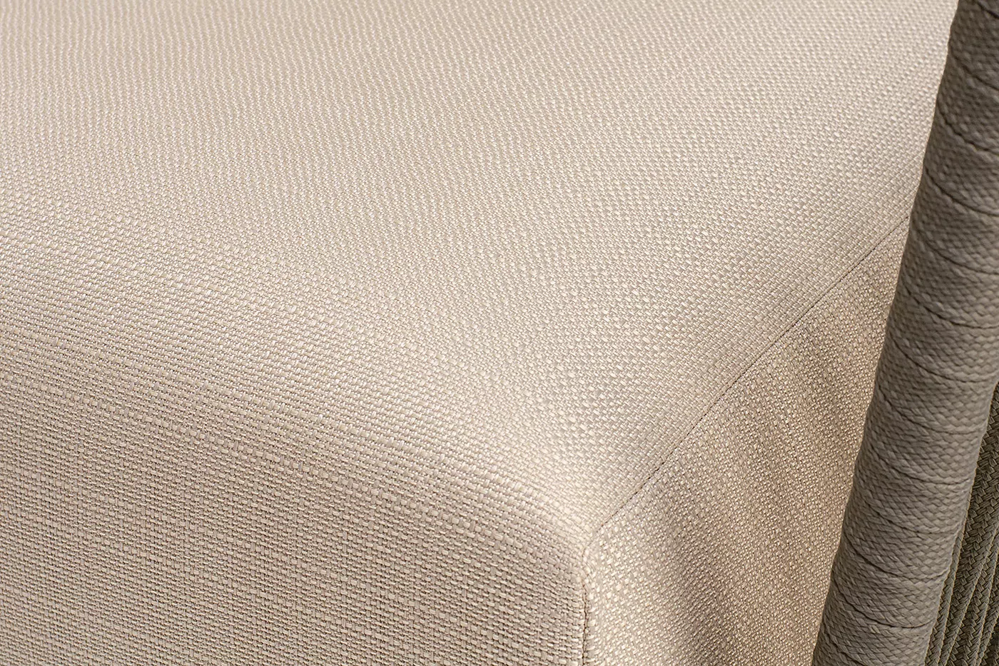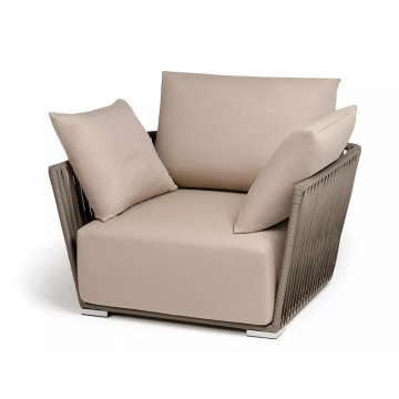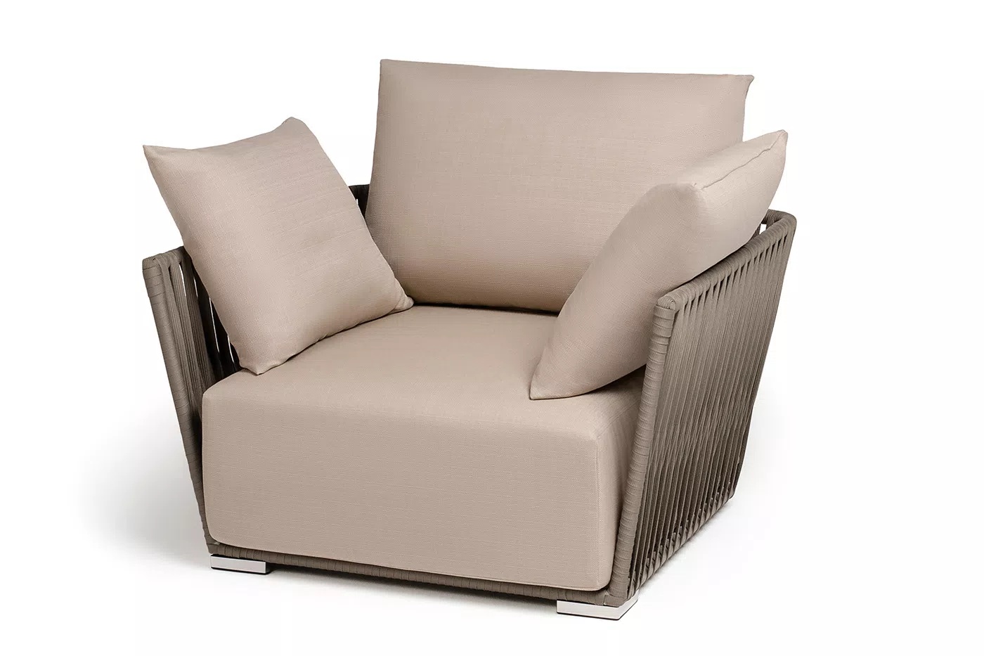 "Форли" кресло плетеное из роупа, каркас алюминий светло-серый (RAL7035) муар, роуп серо-коричневый 23мм, ткань Mossle бежевая