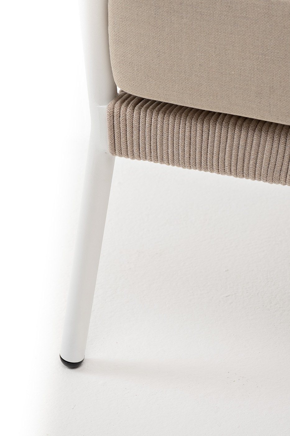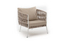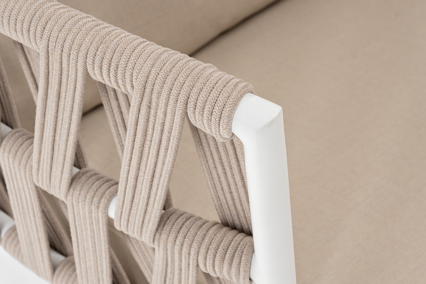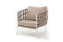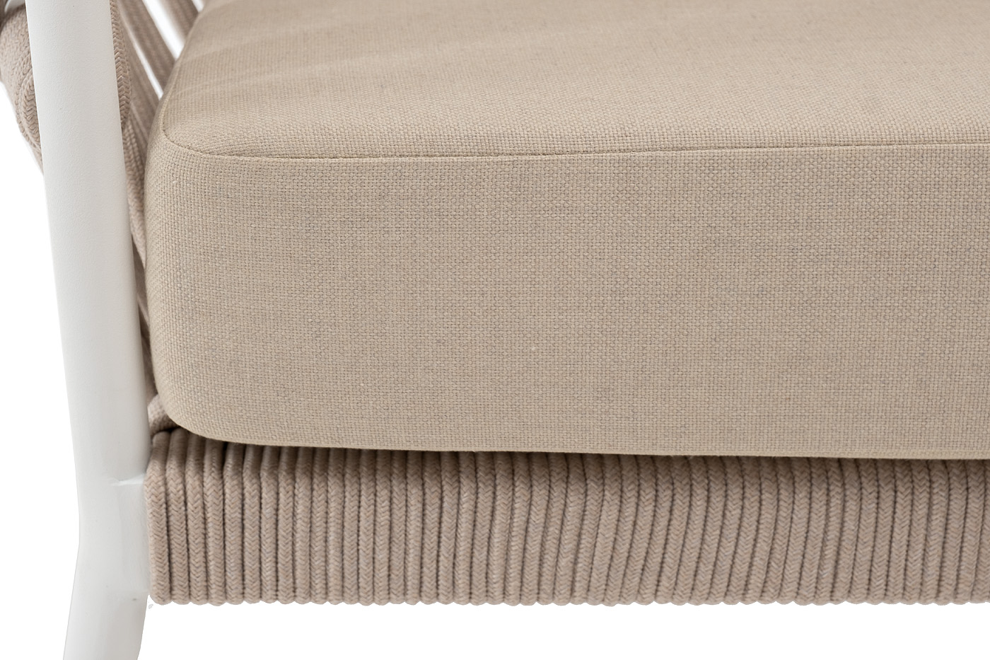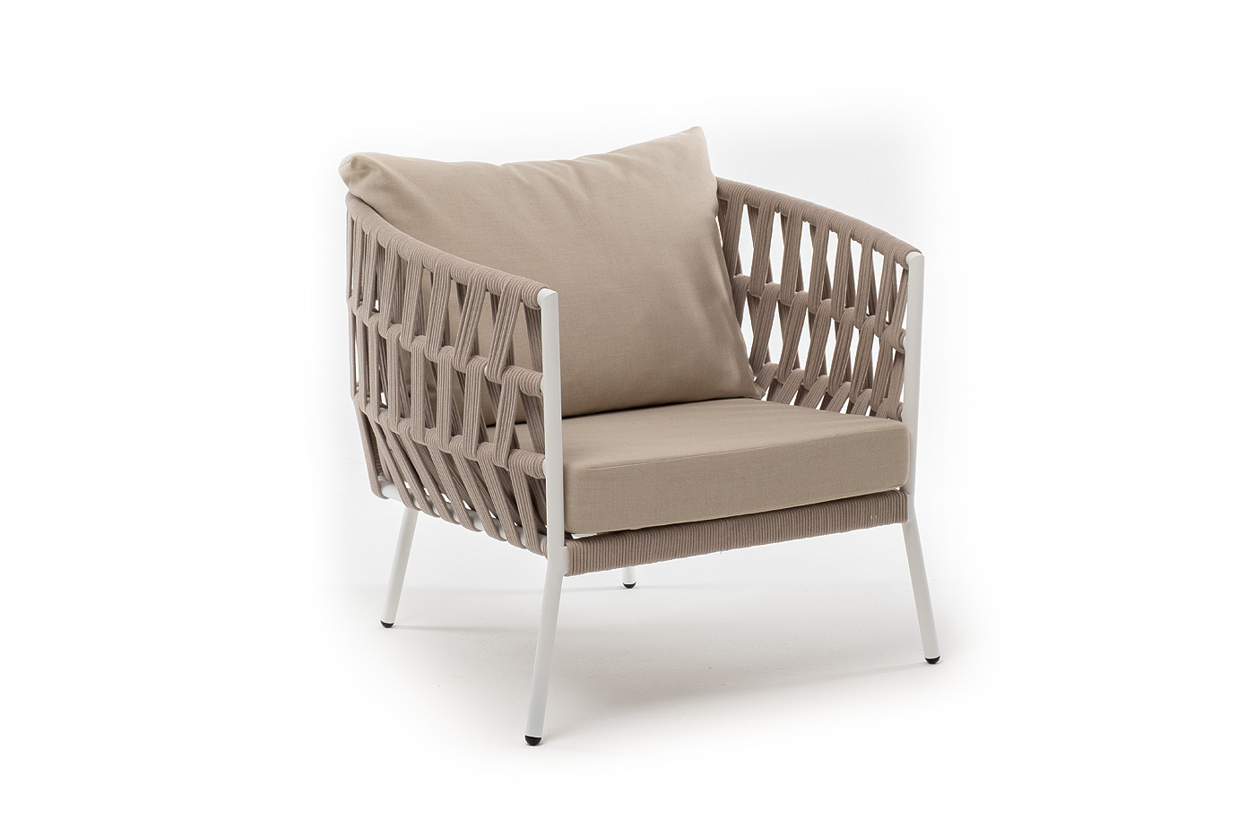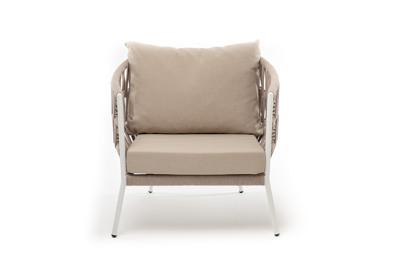 "Диего" кресло плетеное из роупа, каркас алюминий белый муар, роуп бежевый круглый, ткань бежевая 052