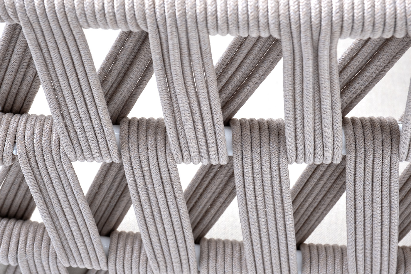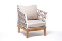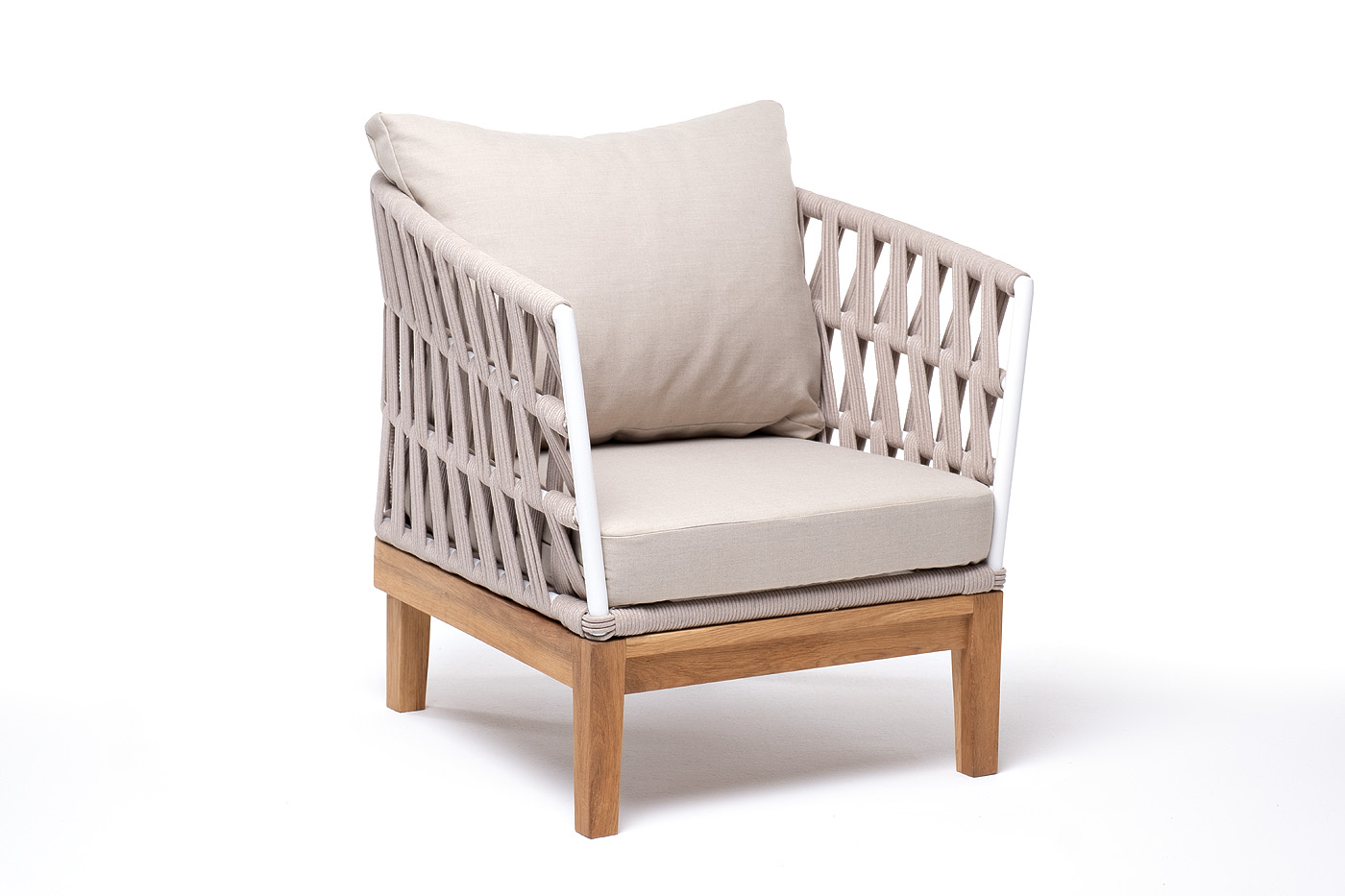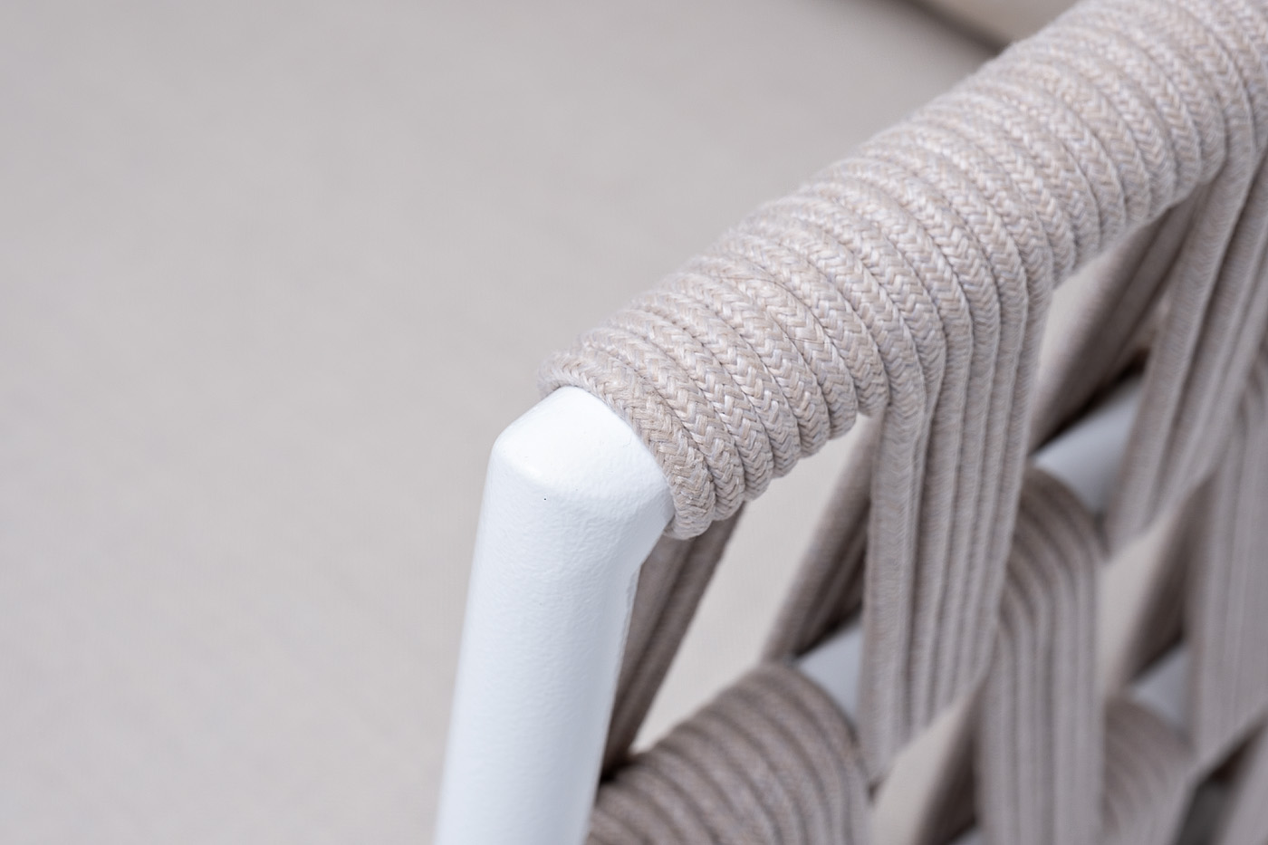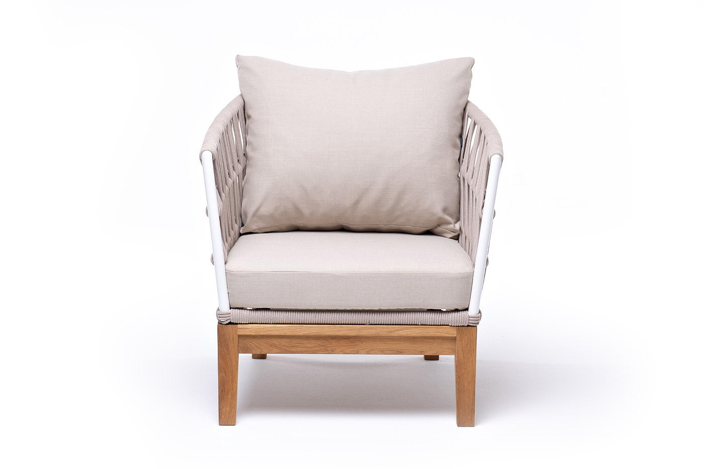 "Диего" кресло плетеное из роупа, основание дуб, каркас алюминий светло-серый (RAL7035) шагрень, роуп бежевый круглый, ткань бежевая 15052