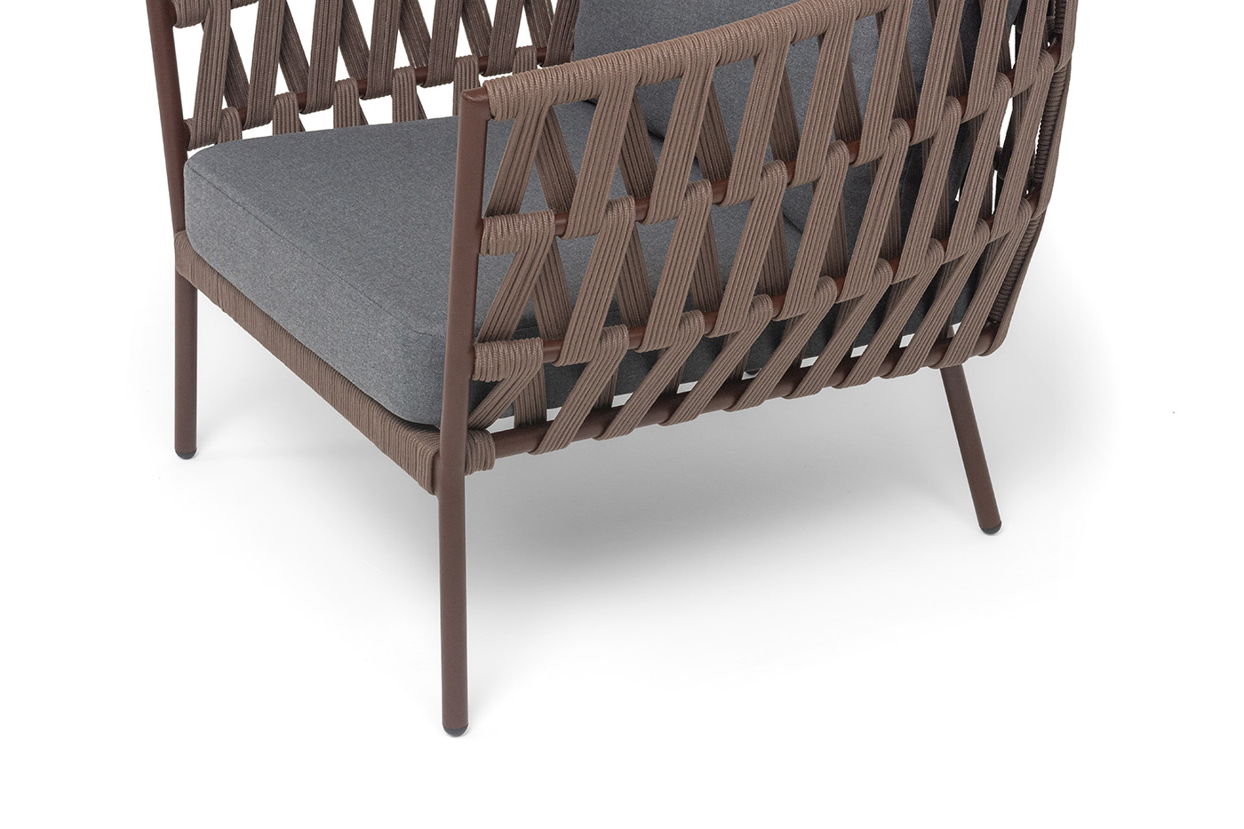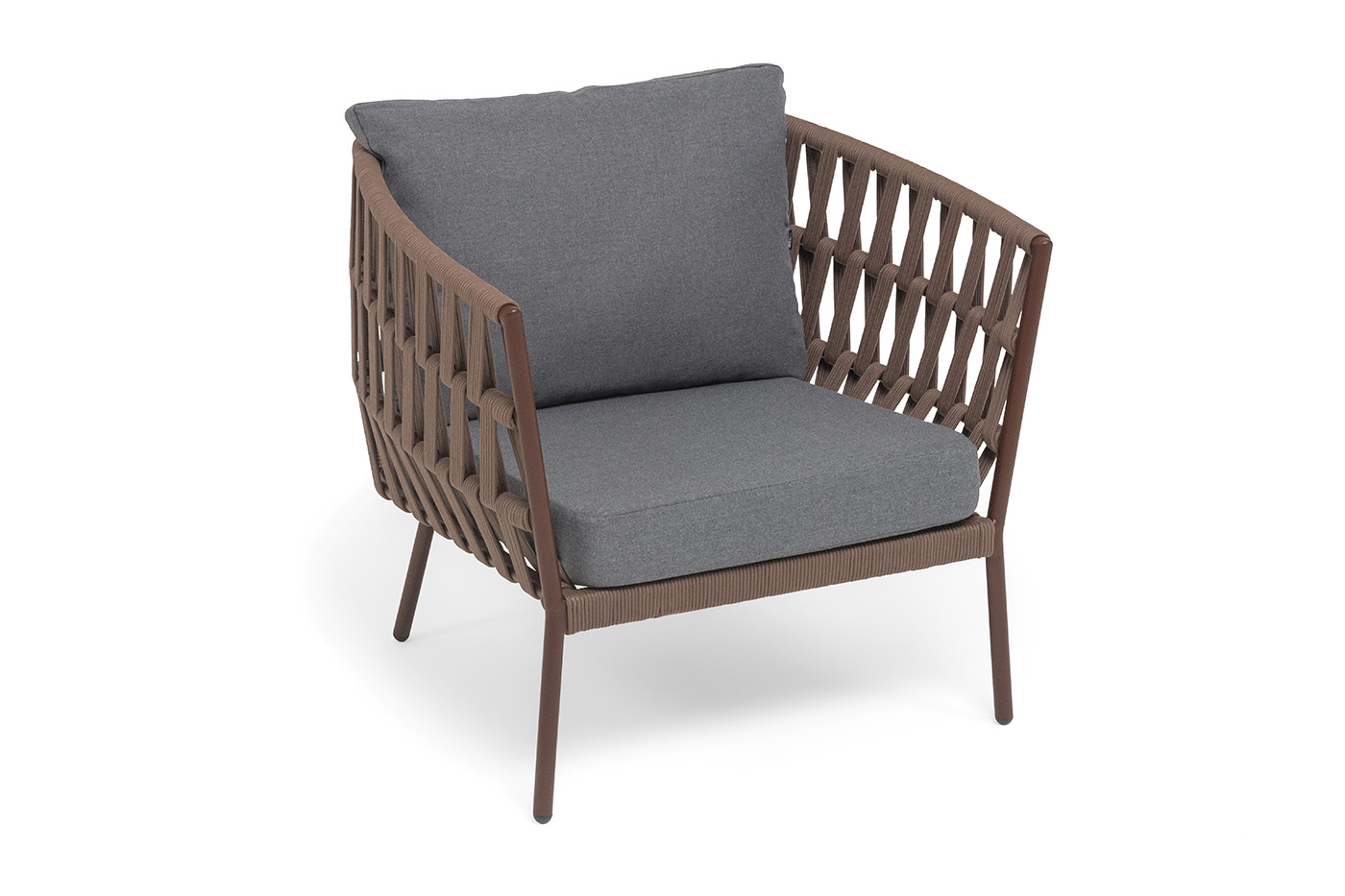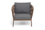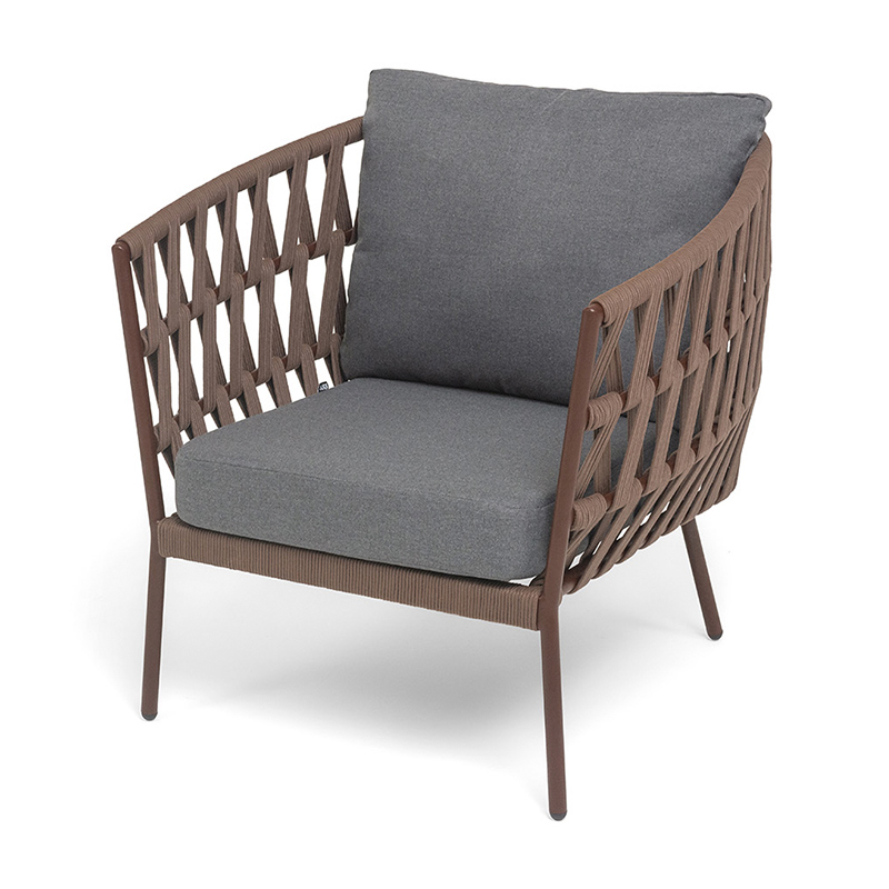 "Диего" кресло плетеное из роупа, каркас алюминий коричневый (RAL8016) муар, роуп коричневый круглый, ткань темно-серая 027
