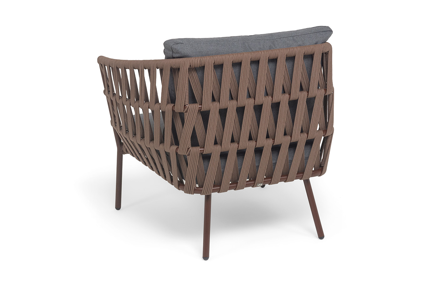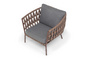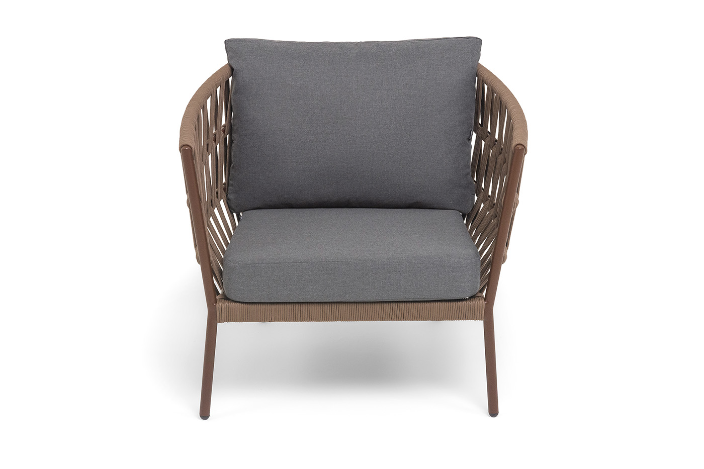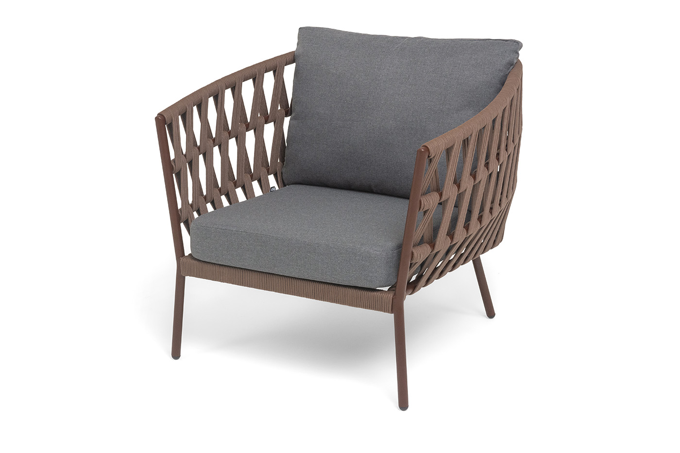 "Диего" кресло плетеное из роупа, каркас алюминий коричневый (RAL8016) муар, роуп коричневый круглый, ткань темно-серая 027