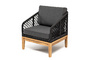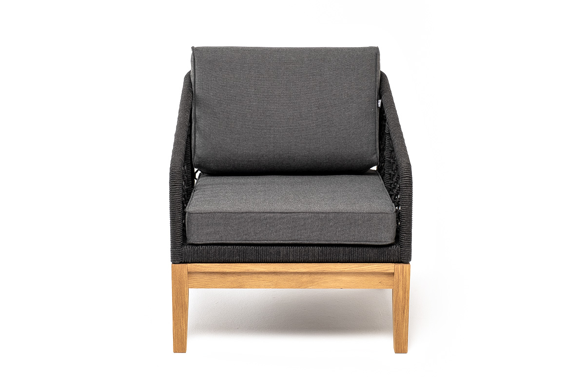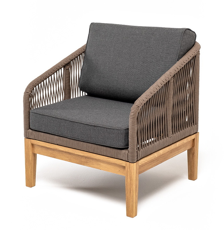 "Канны" кресло плетеное из роупа (узелки), основание дуб, роуп темно-серый круглый, ткань темно-серая 027