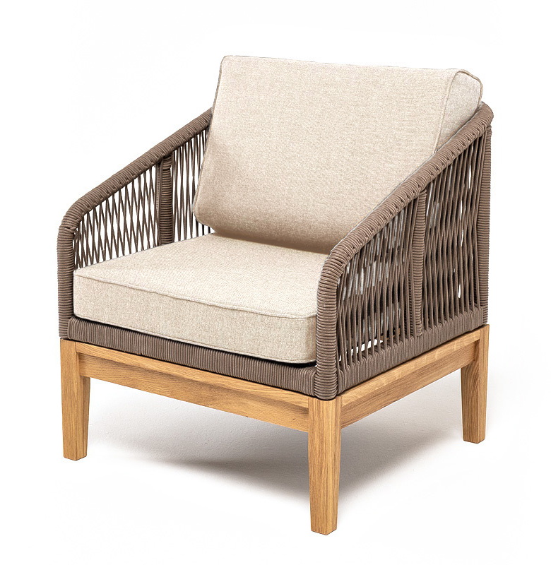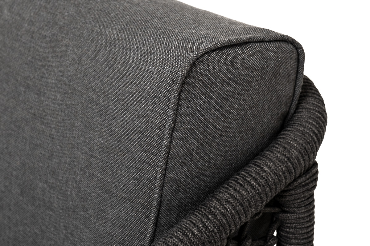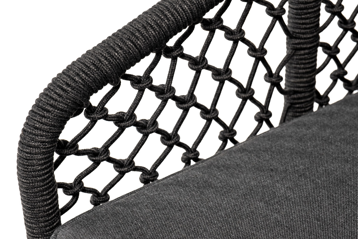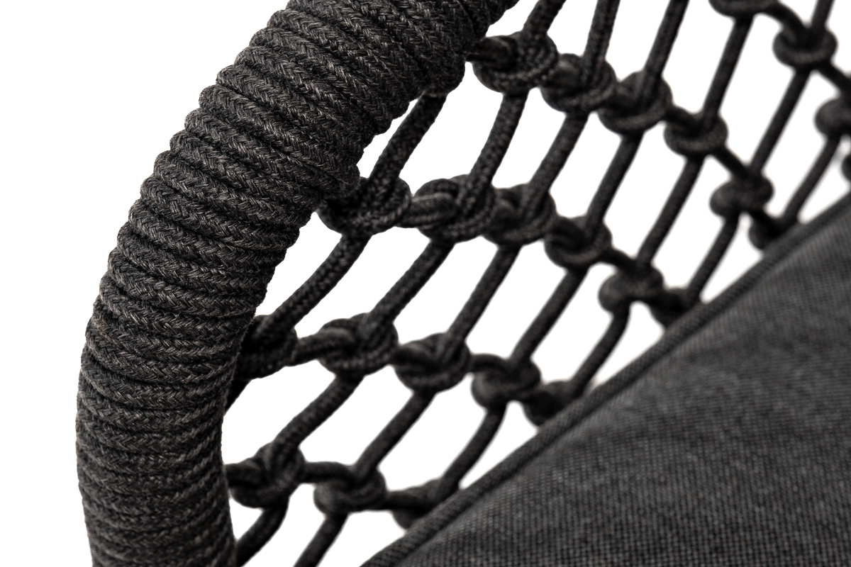Запросить индивидуальное предложениеКресло «Канны» с узловым плетением из роупа идеально подходит для комфортного отдыха в саду или на веранде. На боковинах - оплетка из синтетических лент, выполненных из полиэфирных волокон высокой прочности. Цвет плетения - темно-серый. Вид плетения - узелковый, создавался вручную. Основание - дуб. Приятное дополнение − подушки со съёмными чехлами темно-серого цвета.