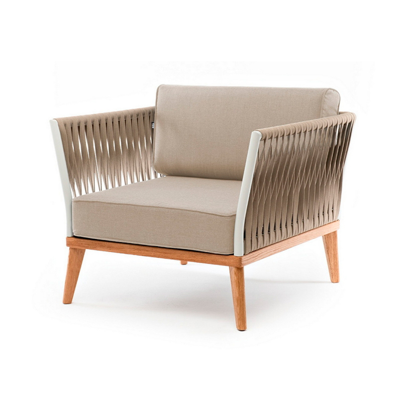 Запросить индивидуальное предложениеПлетеное кресло «Касабланка» с подушками в комплекте. Основание кресла - дуб, каркас из алюминия светло-серого (RAL7035) цвета. Боковины каркаса вручную оплетены роупом - эластичными синтетическими лентами, изготовленными из высокопрочных полиэфирных волокон. Цвет оплетки - серо-коричневый. Подушки со съёмными чехлами, которые обработаны влагоотталивающей пропиткой.