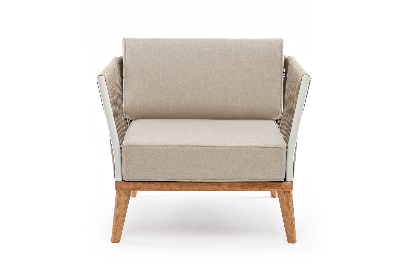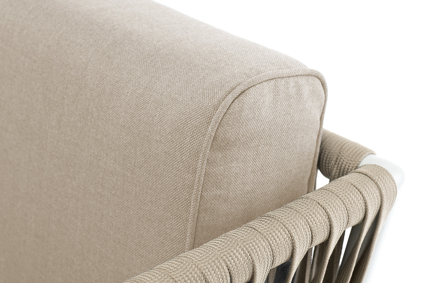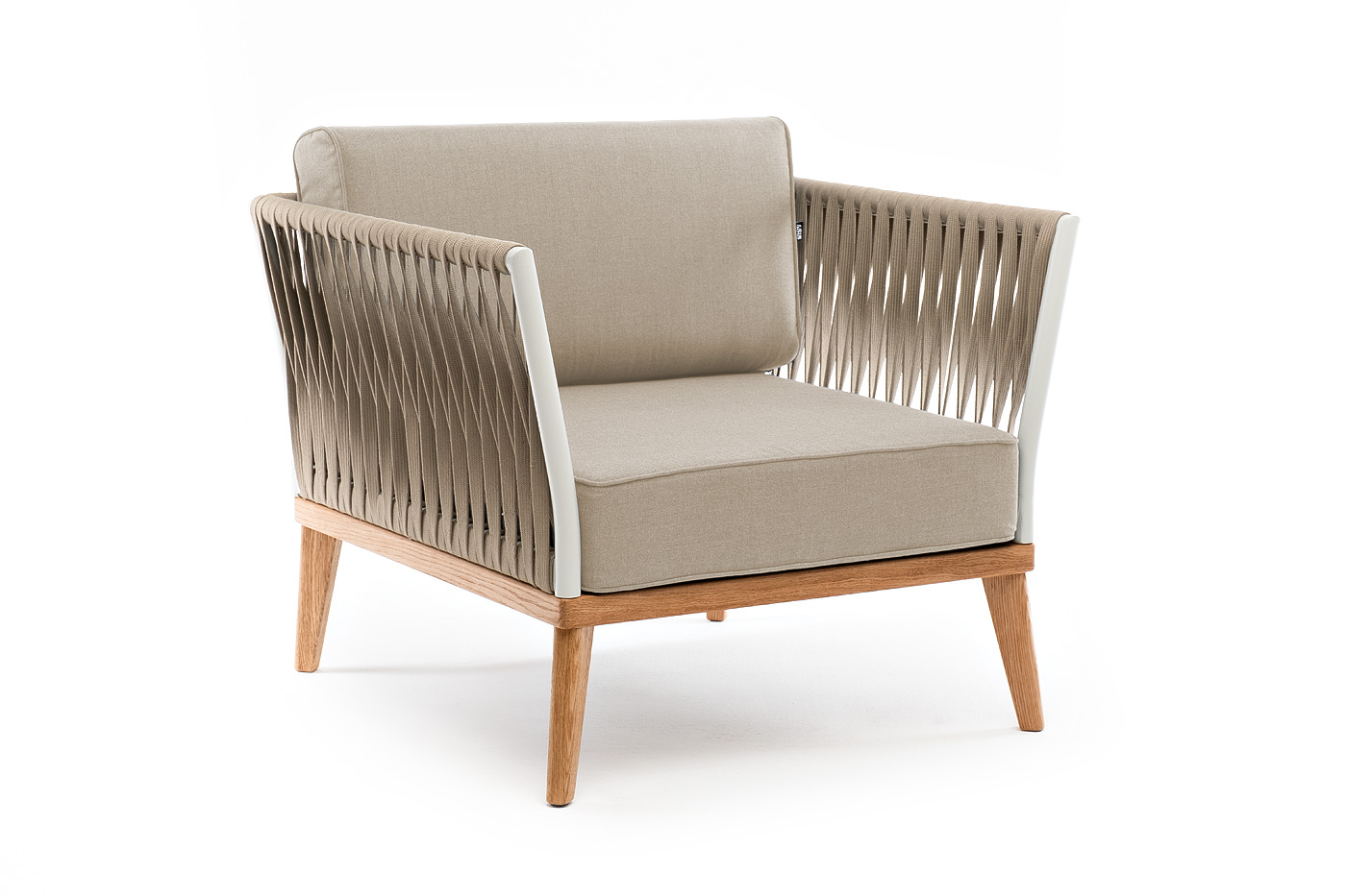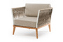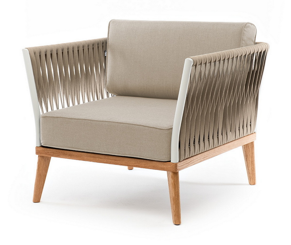 "Касабланка" кресло плетеное из роупа, основание дуб, каркас алюминий светло-серый (RAL7035) муар, роуп серо-коричневый 23мм, ткань бежевая 15052