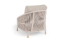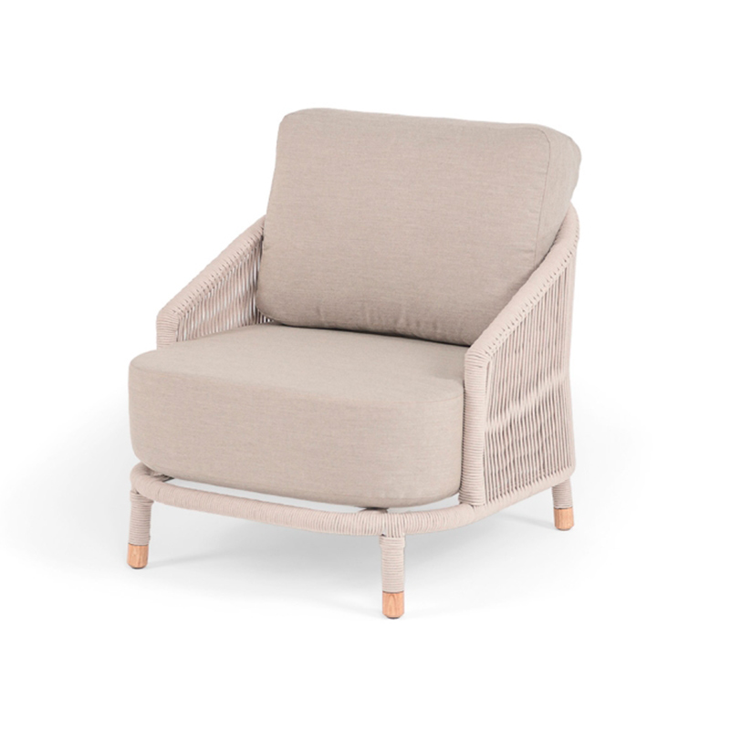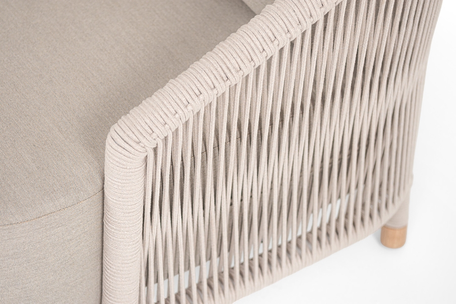Запросить индивидуальное предложениеПлетеное кресло «Верона» с подушками в комплекте. Кресло имеет алюминиевый каркас, окрашенный порошковой краской в белый цвет. Боковины каркаса вручную оплетены роупом - эластичными синтетическими лентами, изготовленными из высокопрочных полиэфирных волокон. Цвет оплетки - бежевый. На ножках кресла идут дубовые наконечники (заглушки). Подушки со съёмными чехлами, которые обработаны влагоотталивающей пропиткой.